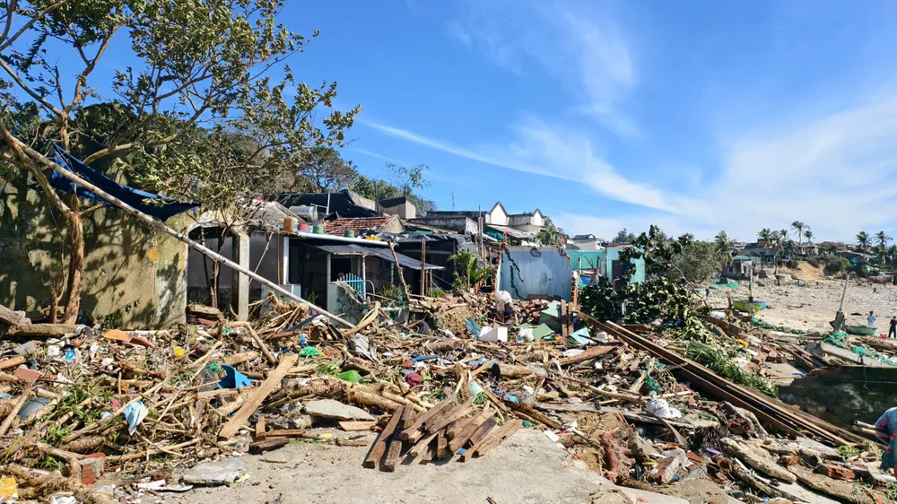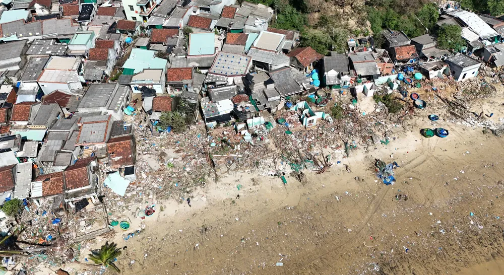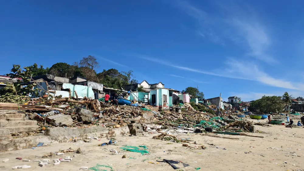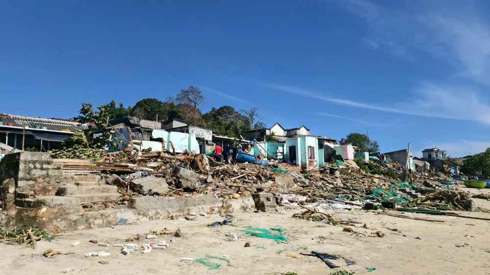 Sáng 7-11, sau khi cơn bão số 13 quét qua, những căn nhà ở làng chài Xuân Thạnh, xã Phù Mỹ Đông, tỉnh Gia Lai đã bị gió lớn, sóng biển dâng cao đánh sập hoàn toàn. Một ngôi làng nhỏ ven biển gần như bị "xóa sổ".