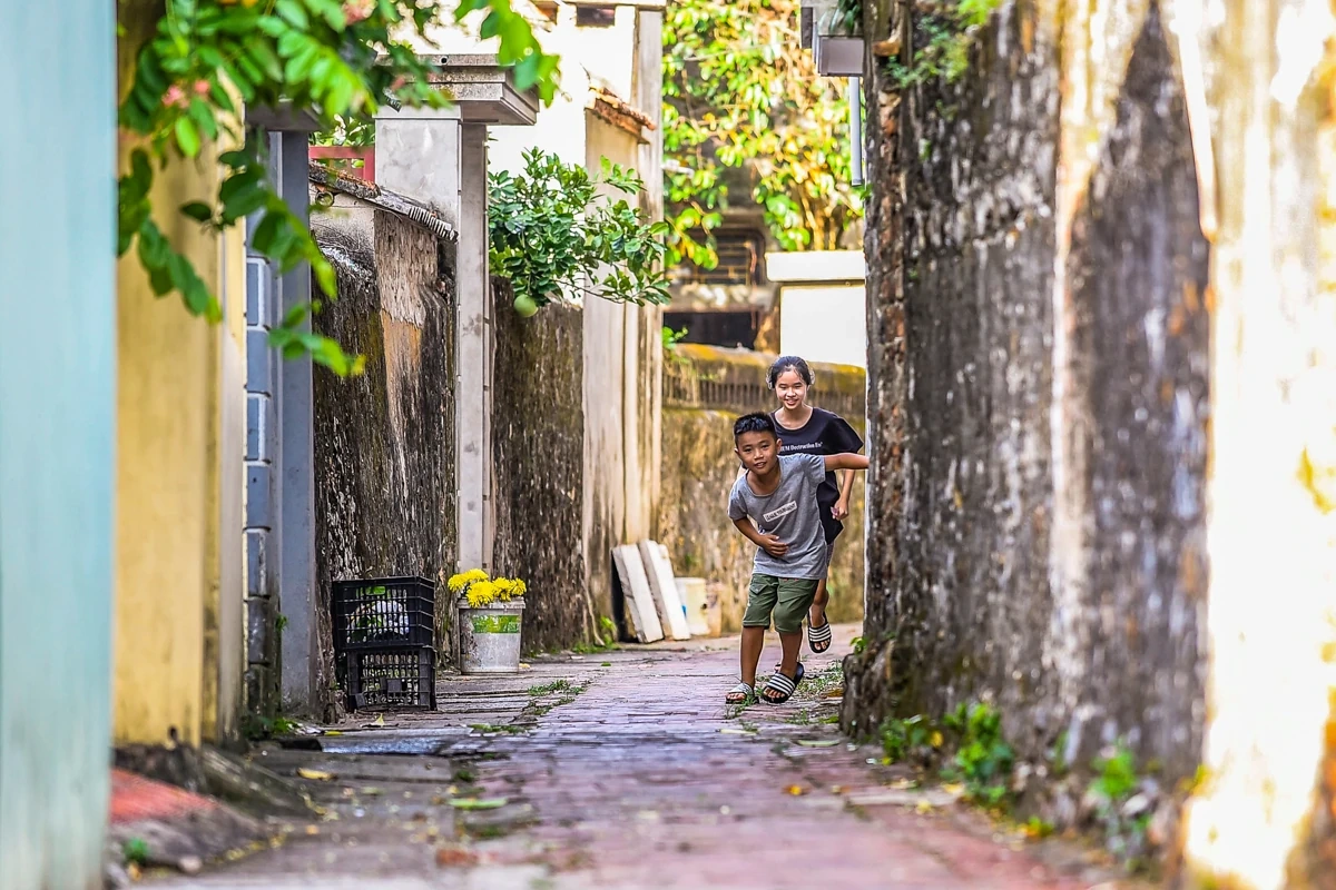 Những buổi trưa yên ả, nắng len qua mái ngói, đổ bóng xuống những con ngõ nhỏ quanh co. Trong ngõ, lũ trẻ ríu rít chơi đùa, tiếng cười trong veo vang lên giữa không gian tĩnh lặng, như làm sống dậy cả một miền ký ức tuổi thơ.