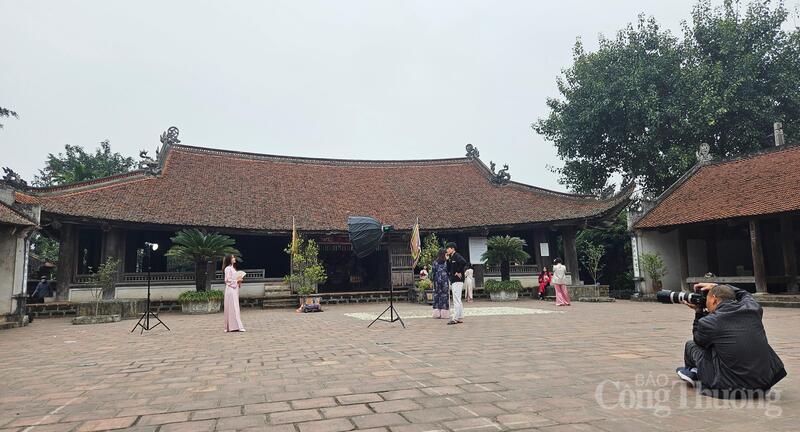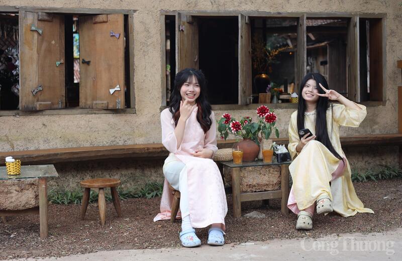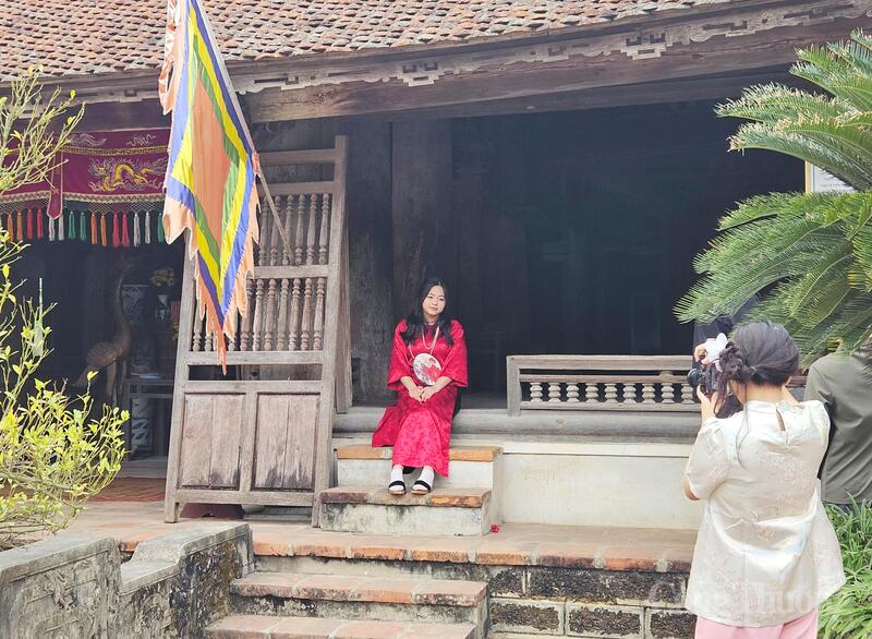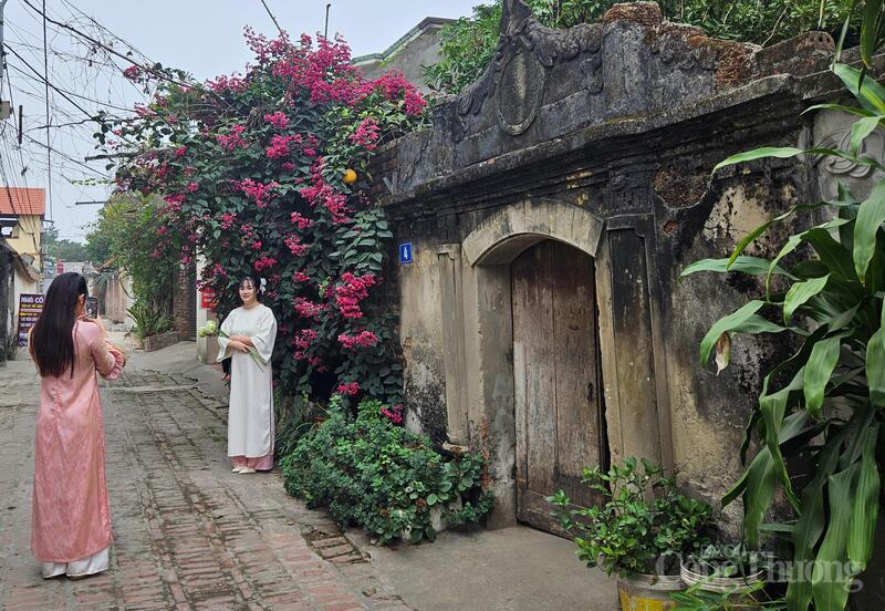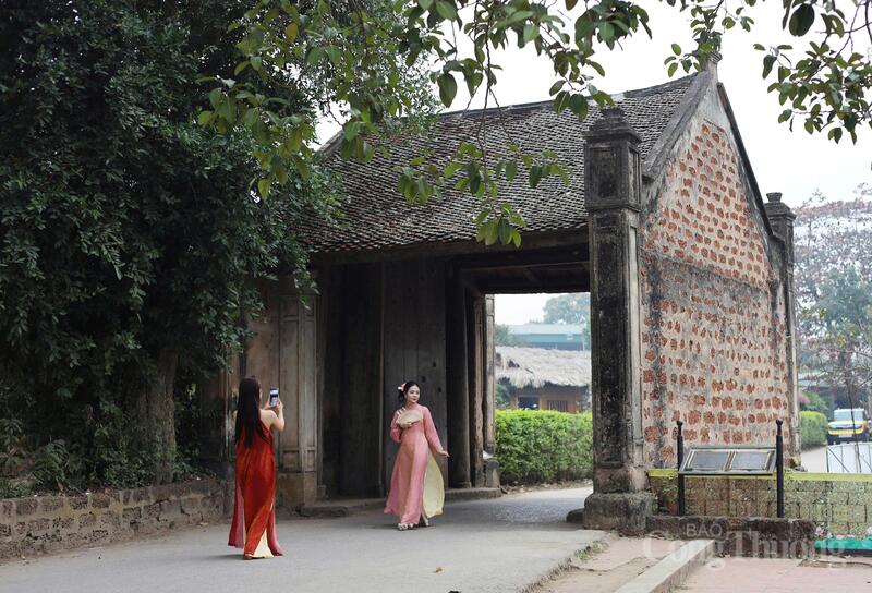 Giữa sắc xuân dịu nhẹ của xứ Đoài, khu vực cổng làng, mái đình, giếng nước và những bức tường đá ong trầm mặc trở thành khung hình đặc biệt cho tà áo dài thướt tha của giới trẻ đến không gian làng cổ trải nghiệm. Sự giao thoa giữa nét cổ kính và hơi thở hiện đại tạo nên những hình ảnh giàu cảm xúc, như nối liền ký ức xưa với hiện tại.
