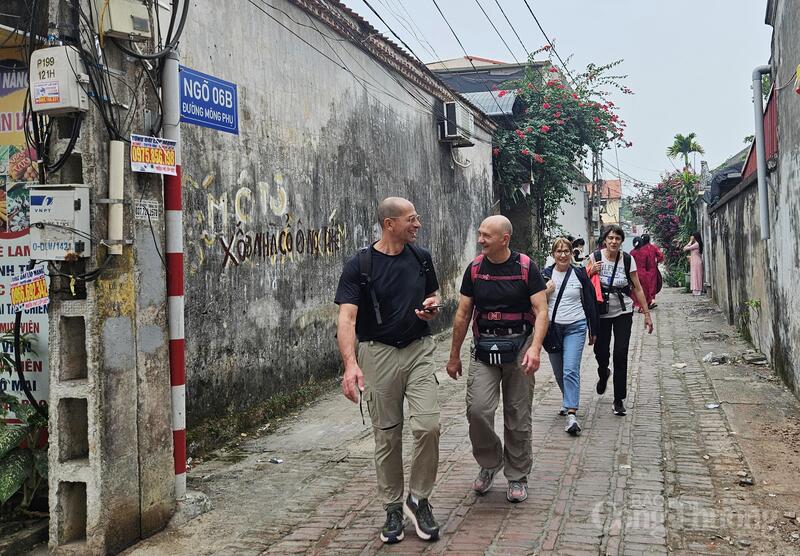 Du khách quốc tế thích thú với không gian làng cổ bình yên, mang bản sắc truyền thống Bắc bộ.