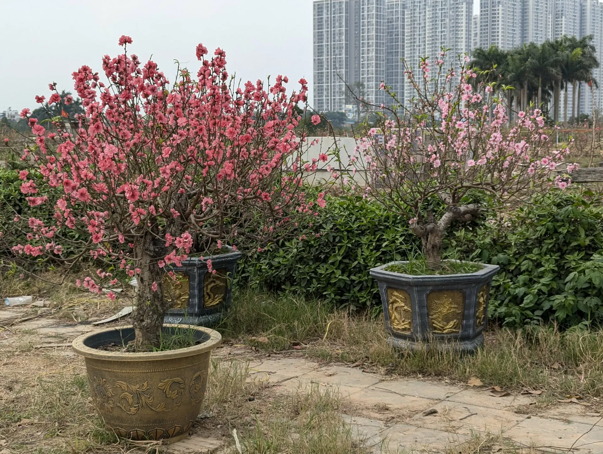 Một cây đào khác đã được đánh lên chậu nhưng do nở sớm, không có khách mua, chủ vườn đành trồng lại.