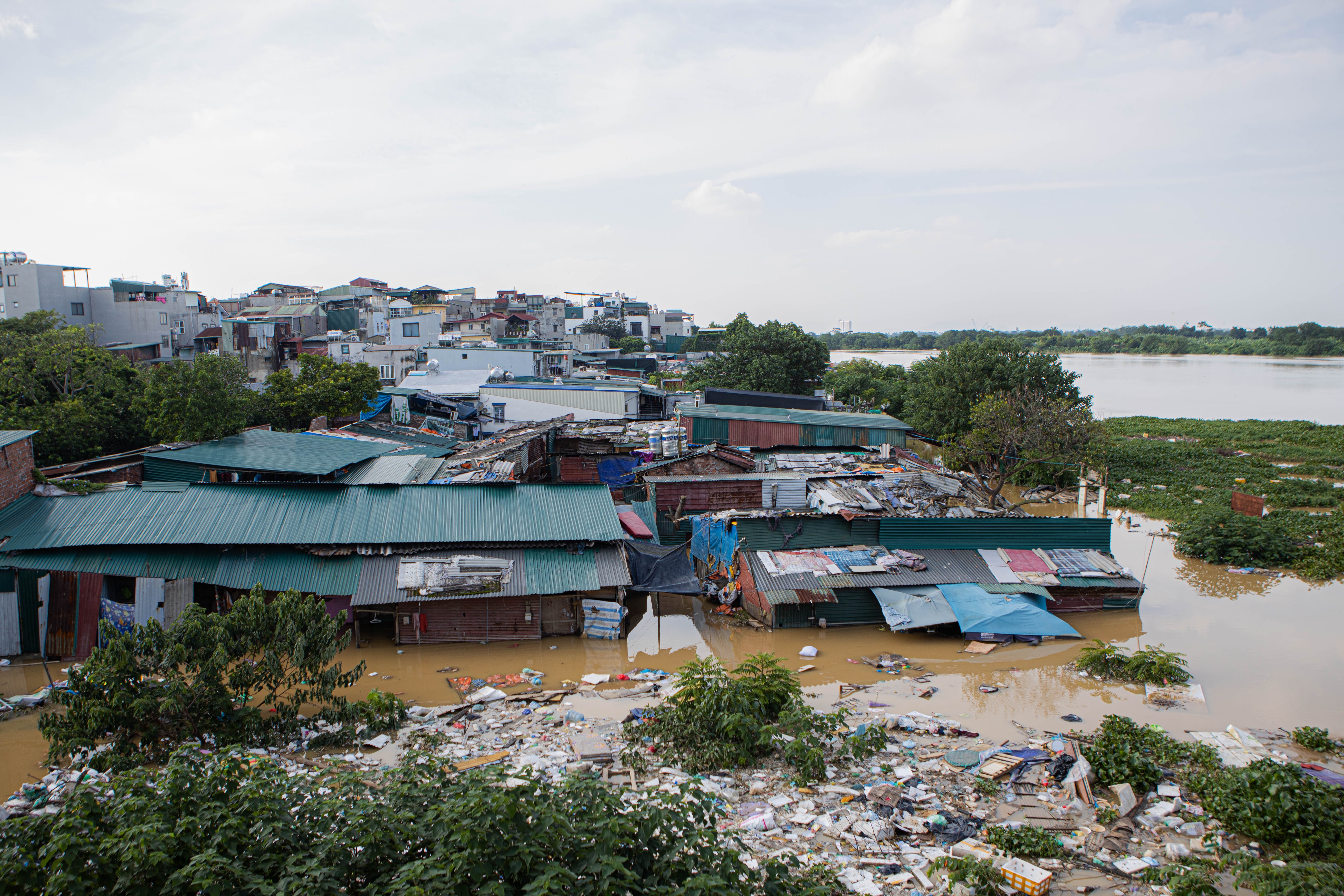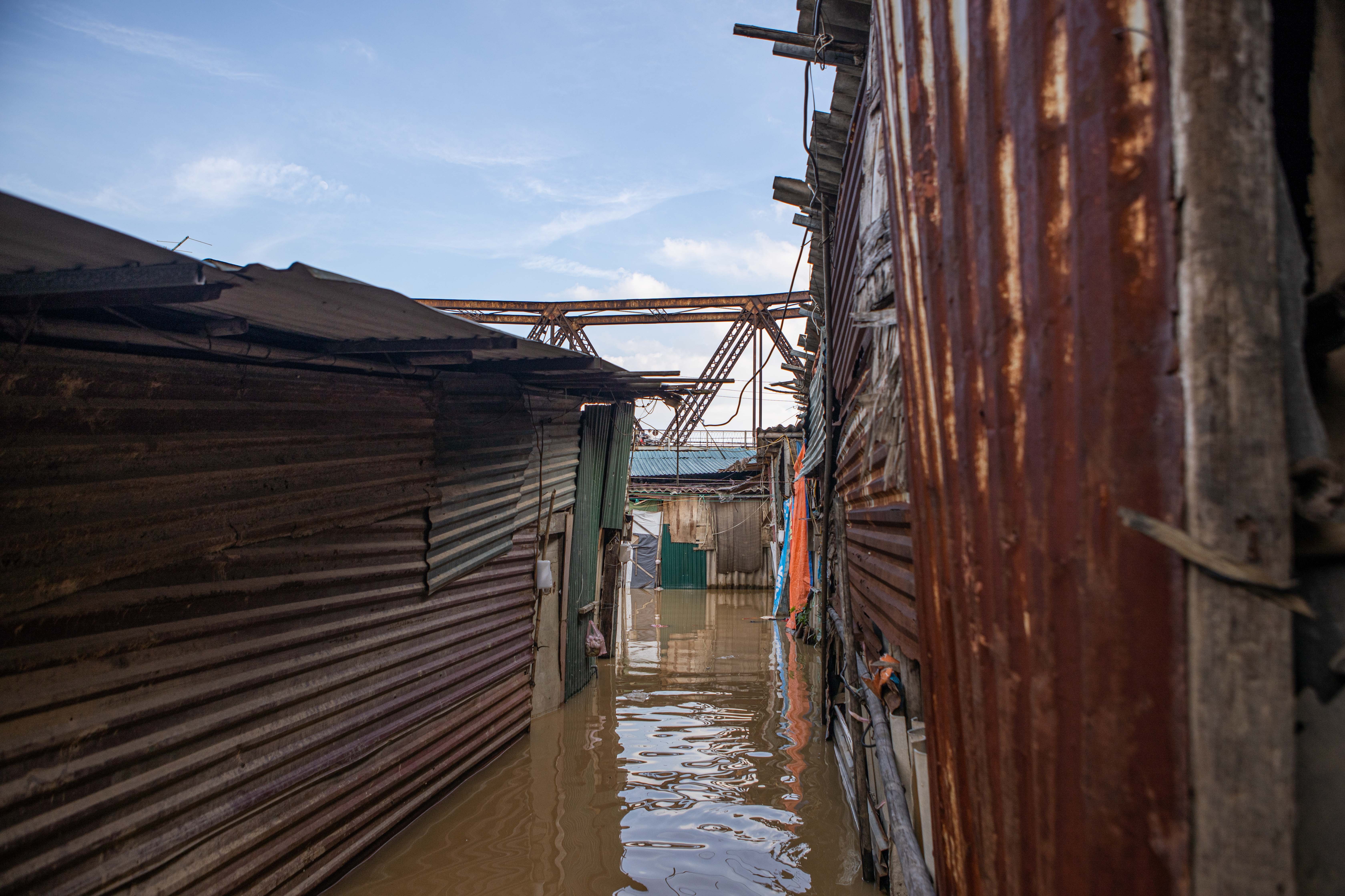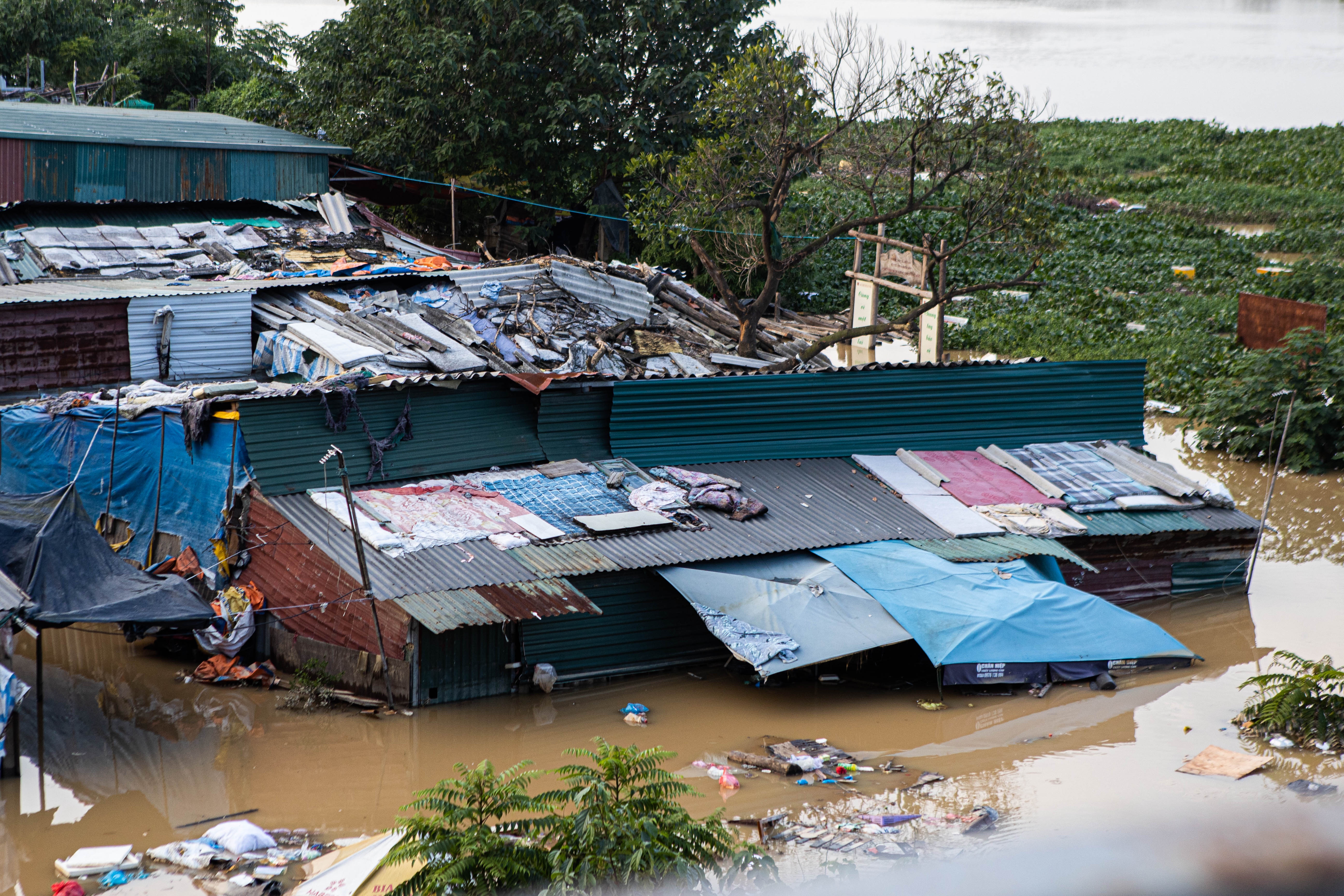 Khu vực xóm trọ sát chân cầu Long Biên chìm trong biển nước lũ.