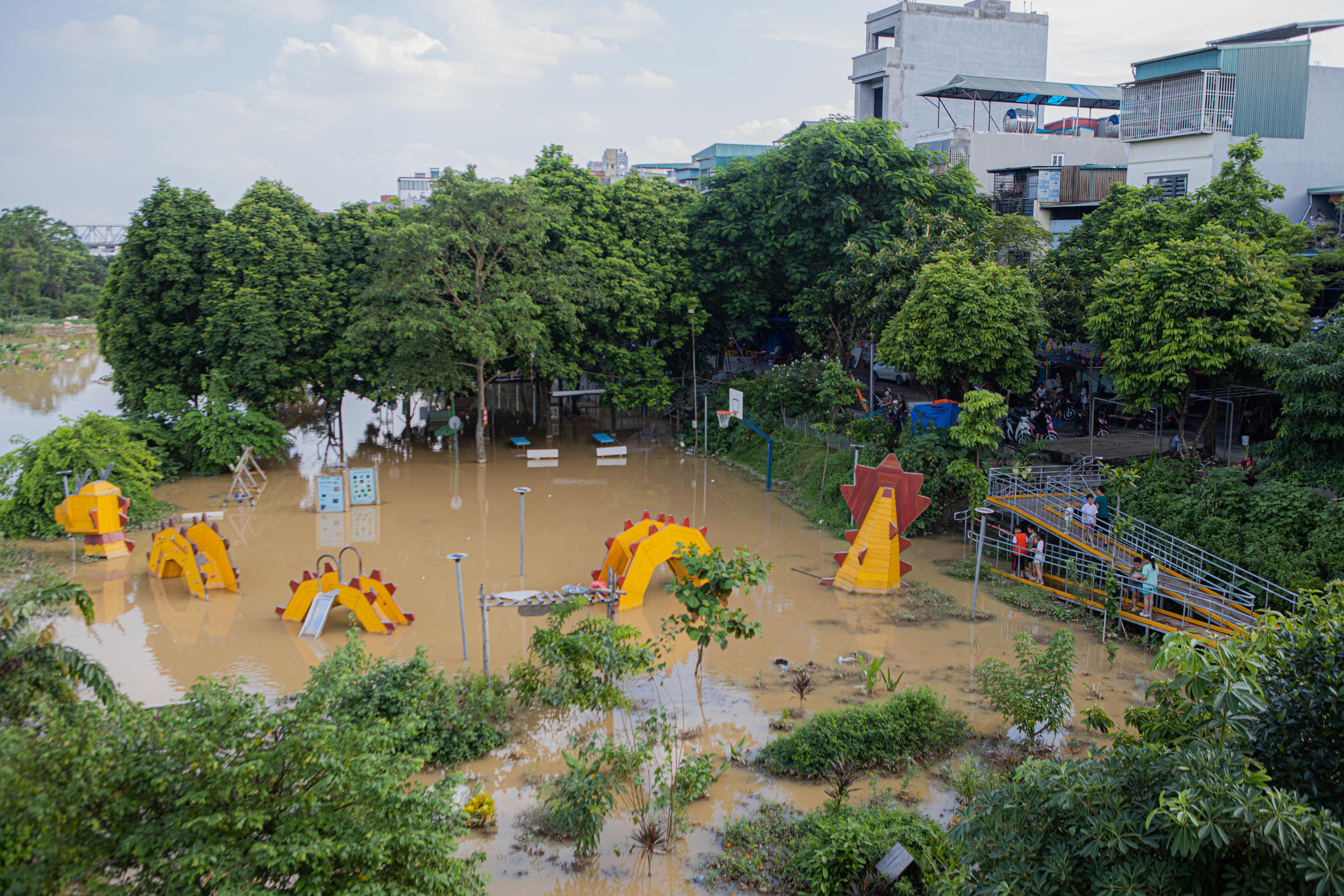 Một khu vui chơi của trẻ em tại một khu dân cư ven sông Hồng vẫn chìm sâu trong dòng nước lũ. “Khu vực công viên ngoài trời để cho con trẻ có không gian nô đùa, nhưng cứ năm nào mưa lớn, công viên cũng ngập trong biển nước”, Bà Hoàng Thị Hoan (87 tuổi) nói.