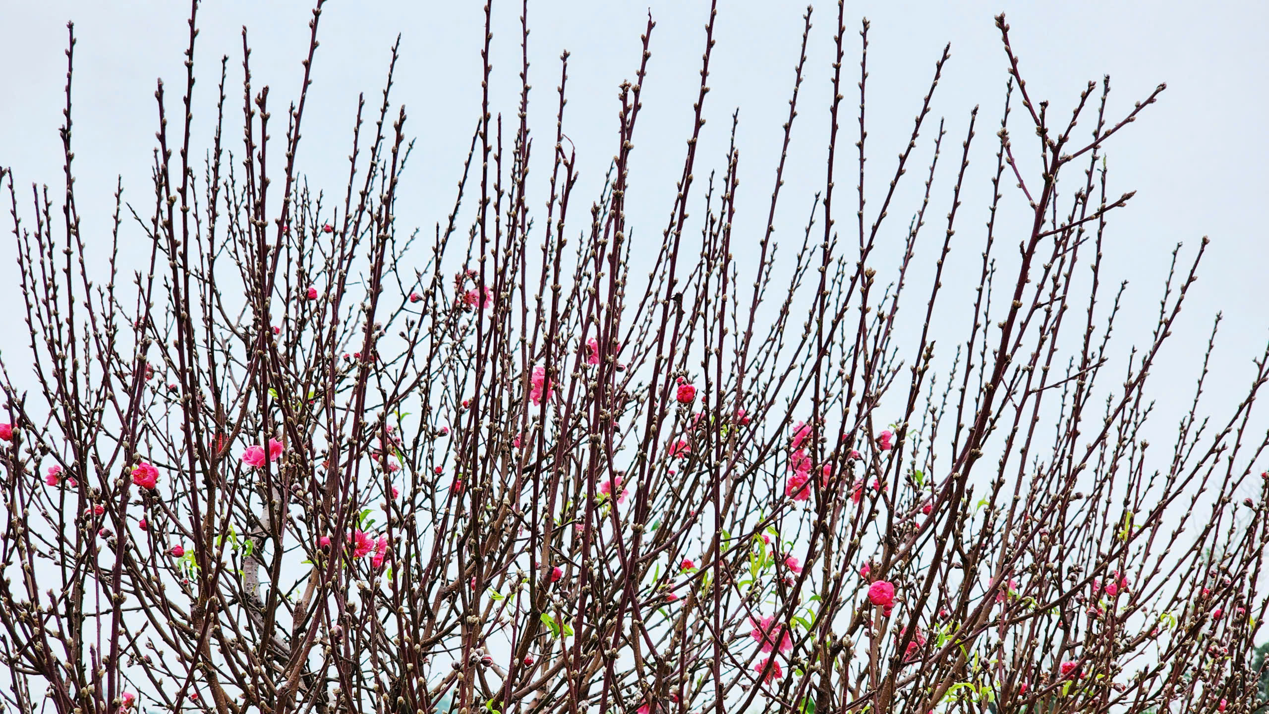 Hàng trăm gốc đào được xếp trên đê sông Cầu dần “bung lụa”, chờ thương lái, người dân đến mua về để chơi tết Bính Ngọ 2026.
