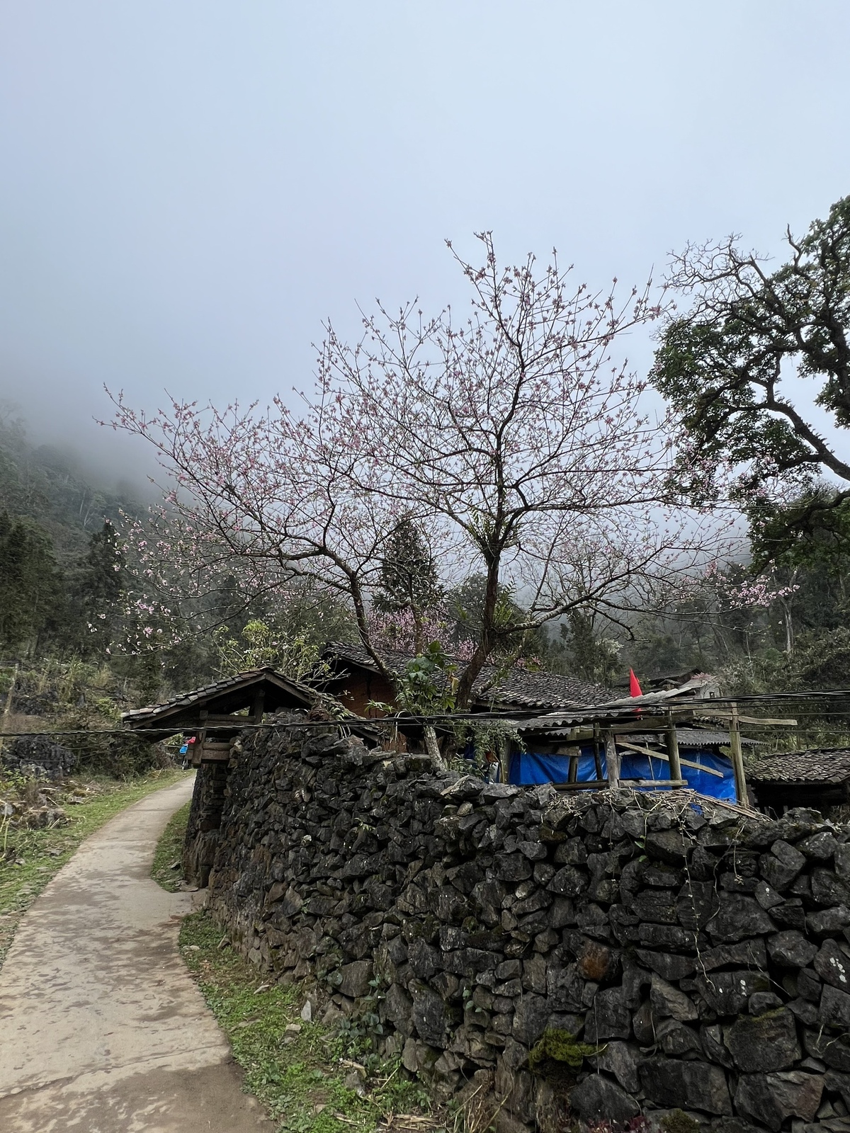 Tuy nhiên, vượt qua cánh cổng đầy ám ảnh đó, cảm giác ghê rợn ngay lập tức tan biến. Thay vào đó, là một cảm giác bình yên đến lạ. Làng Sảo Há hiện ra với những nếp nhà trình tường bằng đất vàng ấm áp, vững chãi, nép mình vào sườn đá. Quanh mỗi ngôi nhà, những bức tường đá cao khoảng 1,5 mét được xếp bằng đá tai mèo một cách tài tình, không cần chất kết dính, vừa để chắn gió, vừa để phân định ranh giới. Những bức tường đá này không chỉ là vật chất mà còn là nét đặc trưng văn hóa độc đáo của người Mông ở đây, nói lên sự gắn bó và tinh thần chinh phục đá của họ.