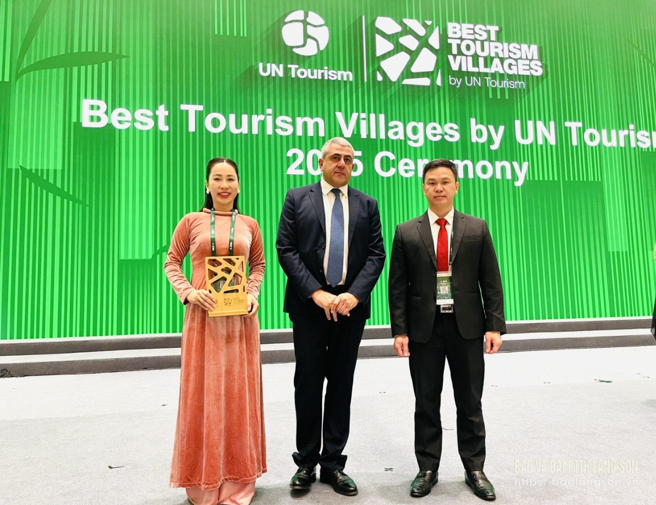 Đại diện lãnh đạo Trung tâm Xúc tiến Đầu tư, Thương mại và Du lịch tỉnh Lạng Sơn nhận giải thưởng “Làng du lịch tốt nhất năm 2025”