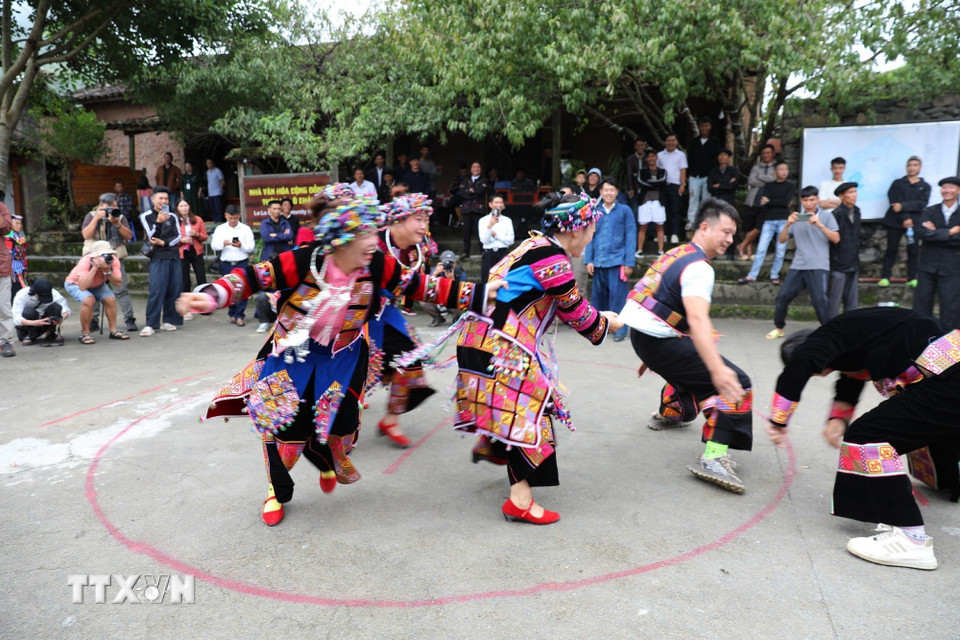 Đồng bào Lô Lô Chải hòa mình trong điệu múa truyền thống, thu hút đông đảo du khách đến thưởng thức và trải nghiệm. (Ảnh: Minh Tâm/TTXVN)