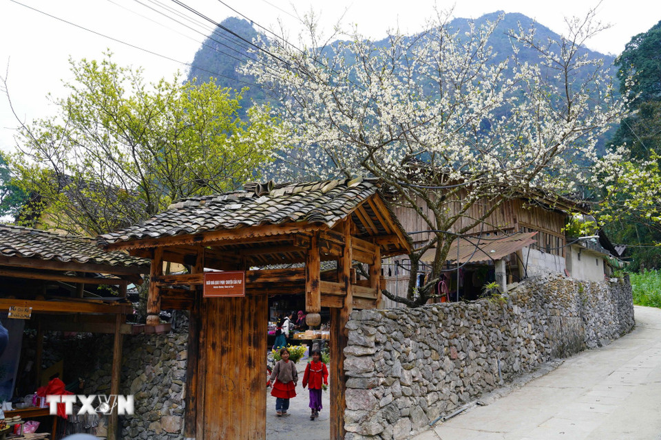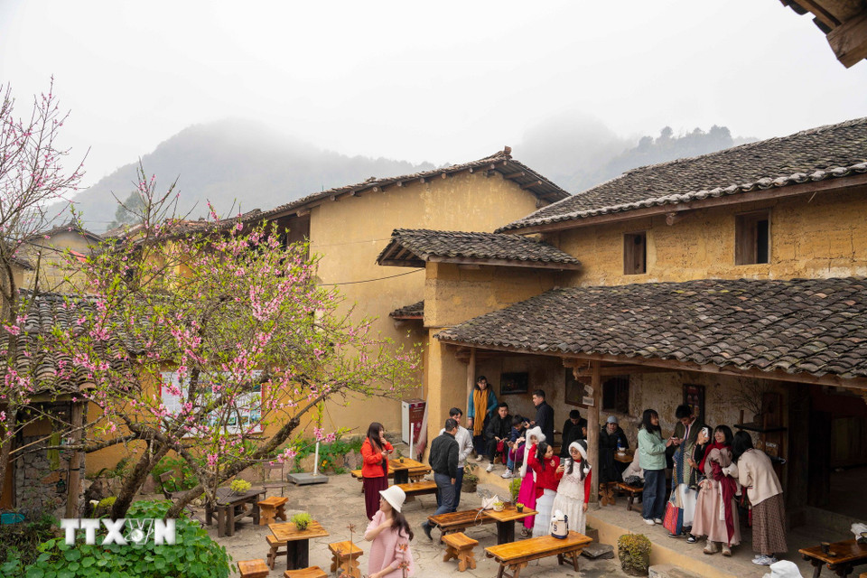 Những cây hoa đào nở rộ phần nào thu hút thêm khách du lịch đến với thôn Lô Lô Chải. (Ảnh: Khánh Hòa/TTXVN)