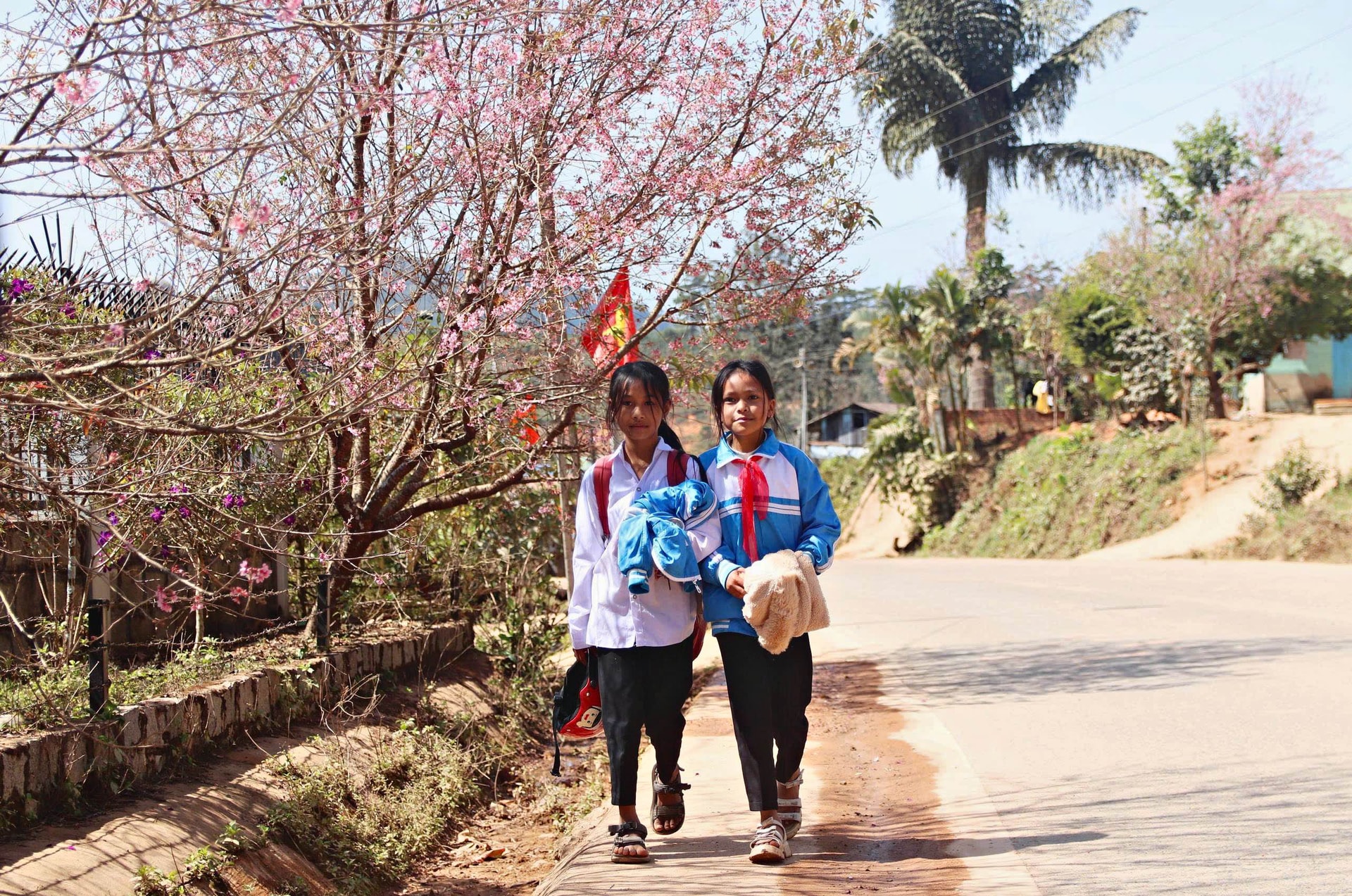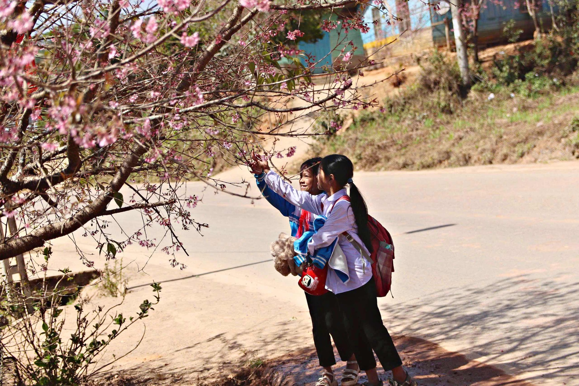 Học sinh vùng sâu làng Đưng K'Si vui chơi bên mai anh đào những ngày chiều cuối năm