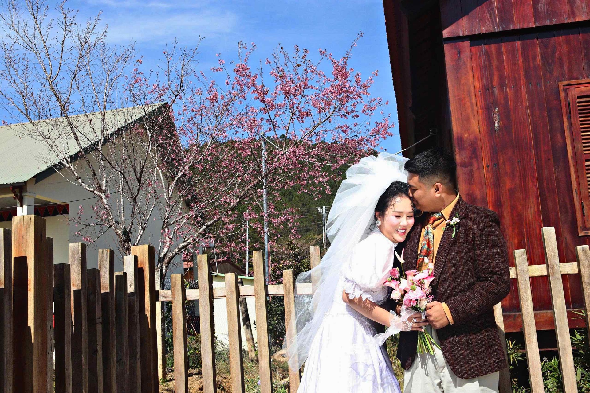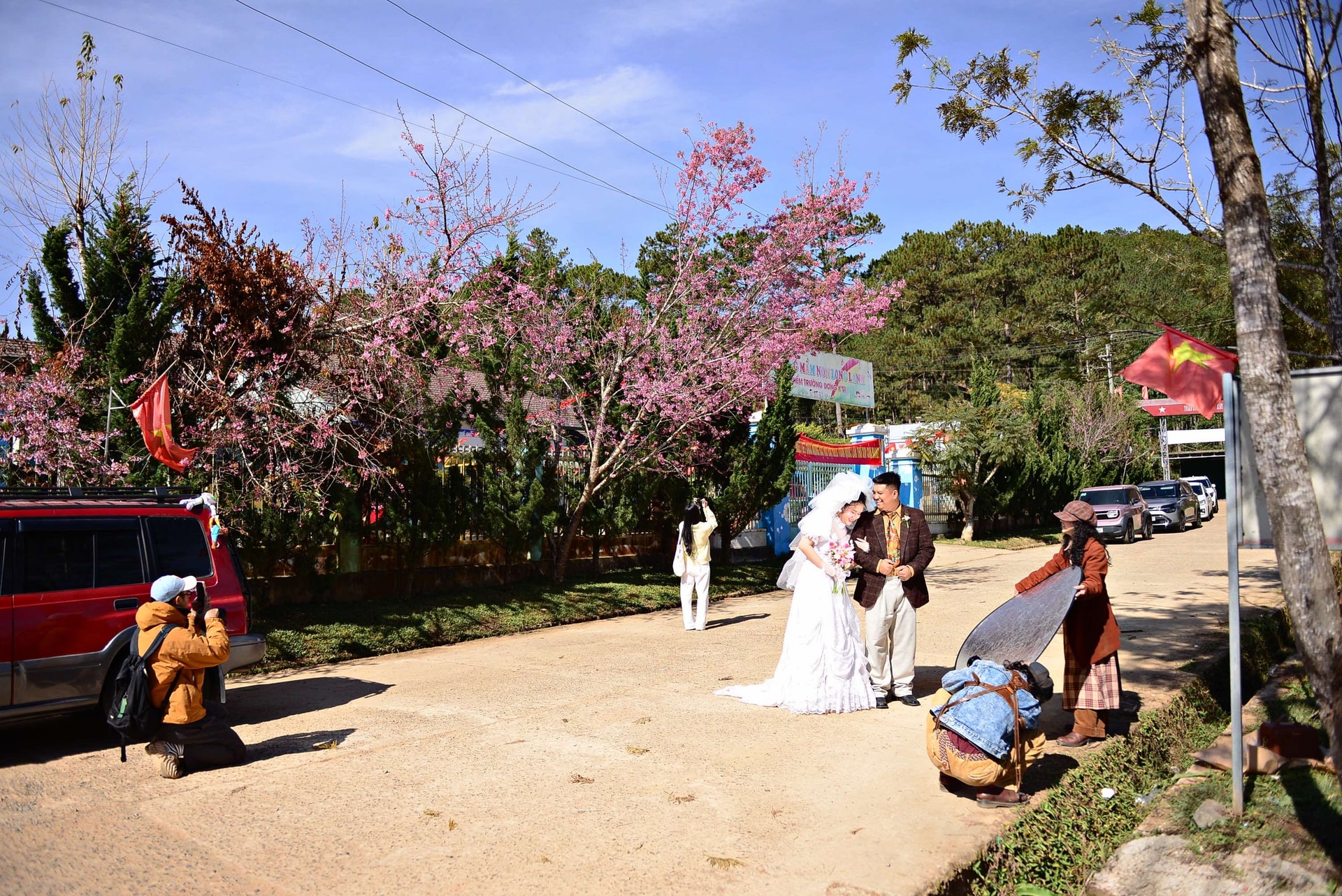 Nhiều cặp đôi không ngại vượt đường xa đến làng Đưng K'si ghi lại những khoảnh khắc, kỷ niệm đẹp bên hoa mai anh đào