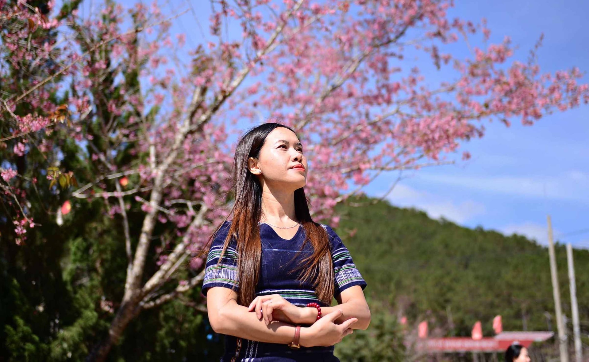 Du khách Quách Hạnh Phương, đến từ Hà Nội, chia sẻ niềm vui khi được "check-in" với dãy mai anh đào nở rộ tại làng Đưng K'Si