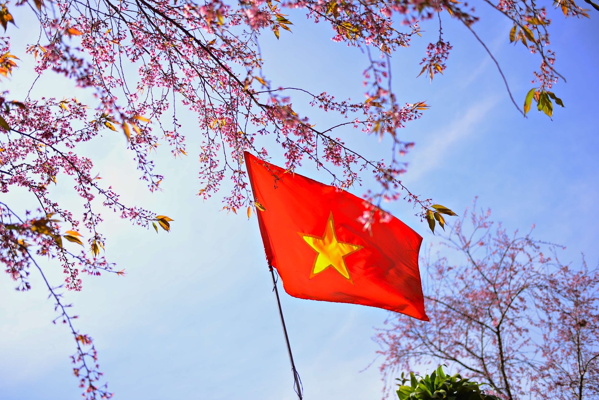 Cờ đỏ sao vàng chào mừng ngày hội lớn của đất nước tung bay trong nắng ấm buôn làng Đưng K'si, hòa cùng sắc hồng của mai anh đào tạo nên một bức tranh tuyệt đẹp