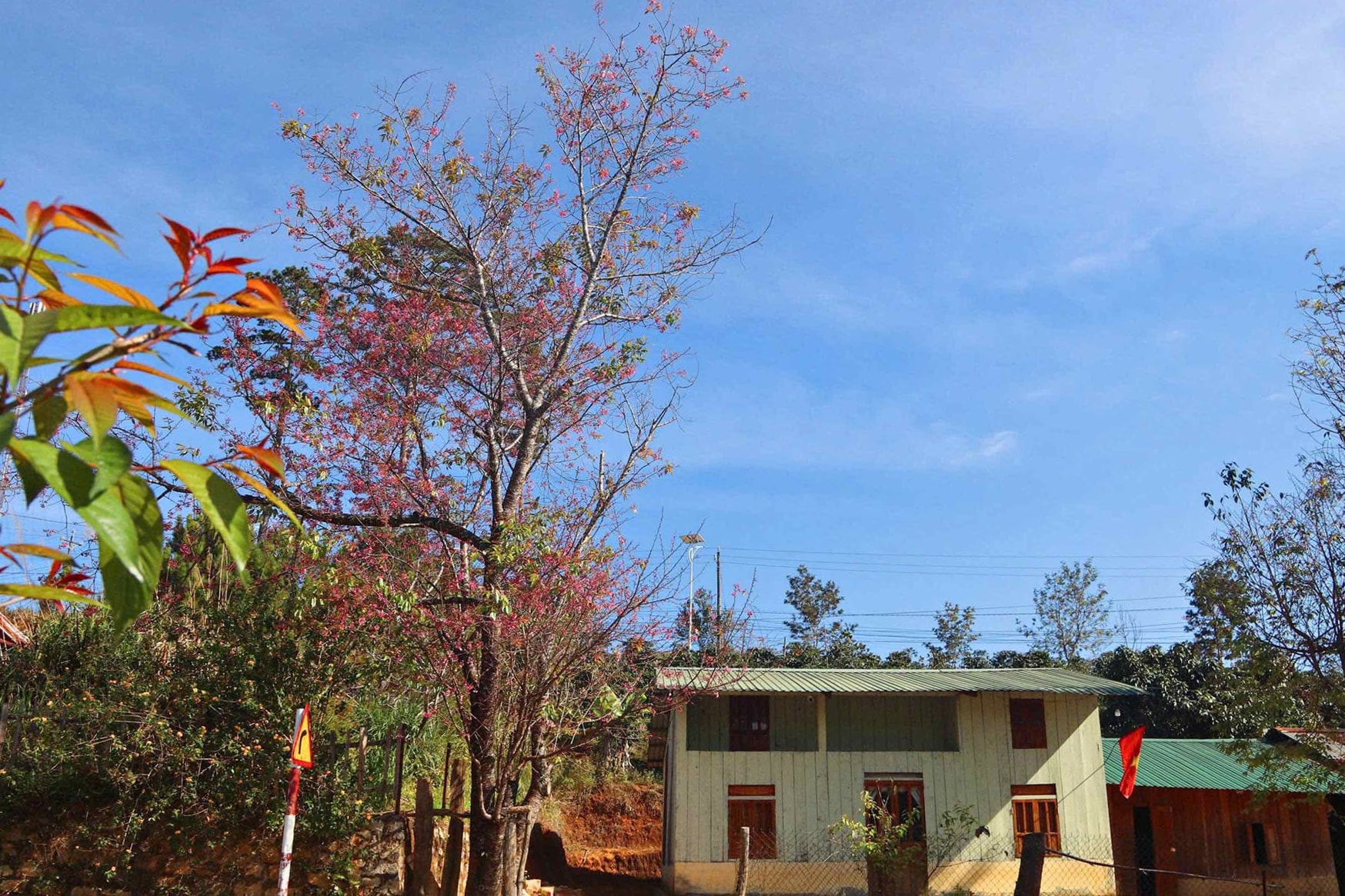 Dọc các con đường đất đỏ, quanh những nếp nhà của đồng bào K'Ho, hoa mai anh đào đồng loạt bung nở, nhuộm hồng cả một vùng đất yên bình.