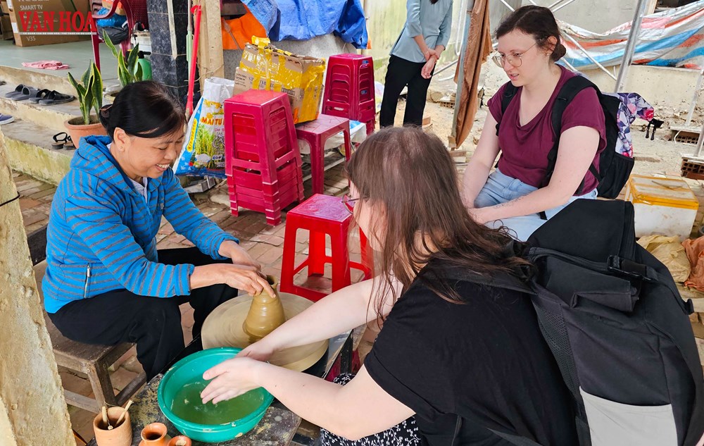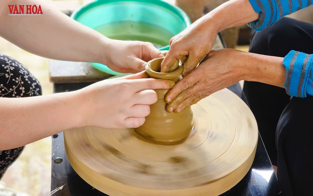 Tại các xưởng gốm, du khách được các nghệ nhân tận tình hướng dẫn, trực tiếp trải nghiệm các công đoạn như xoay bàn gốm, tạo hình, nặn sản phẩm