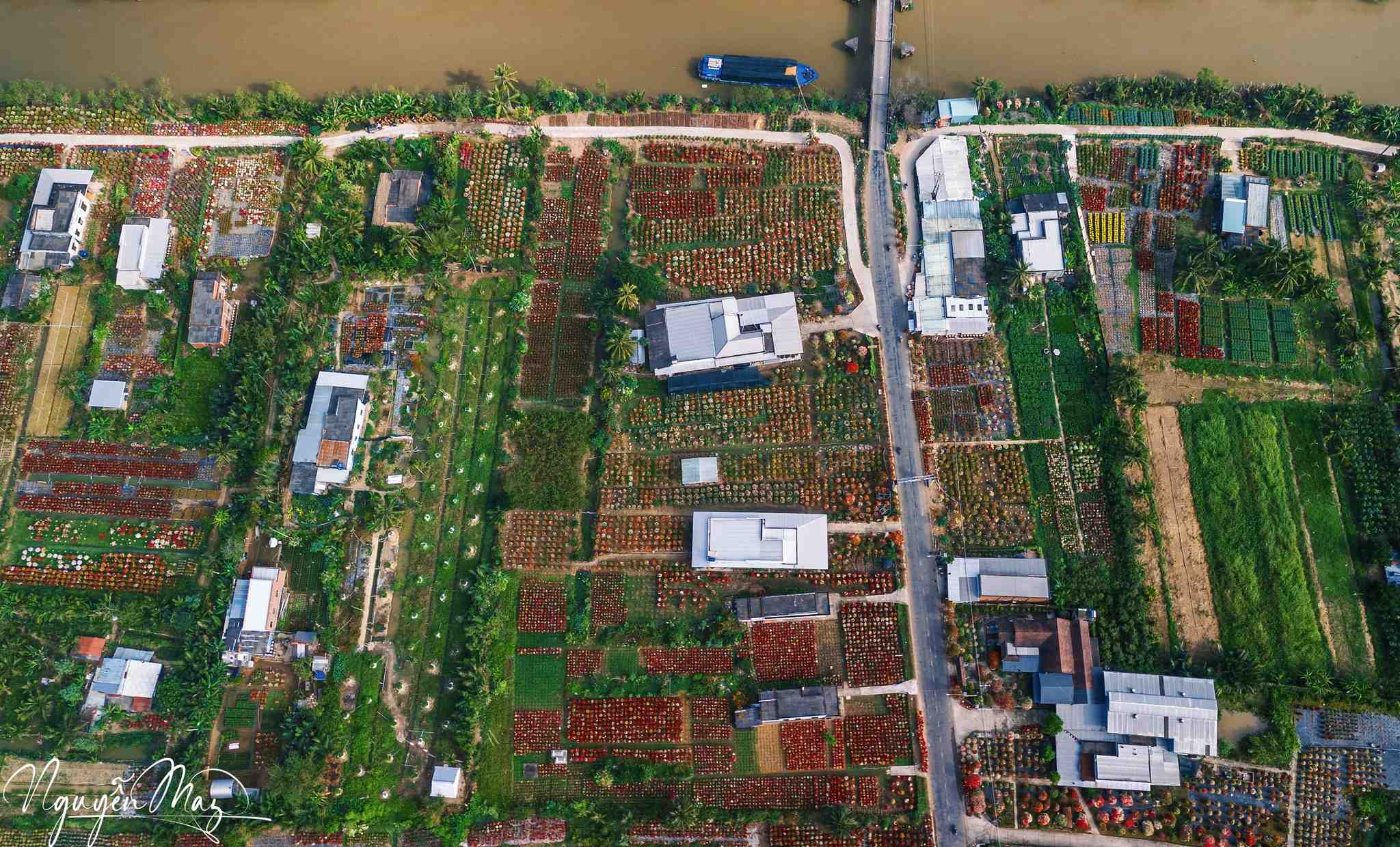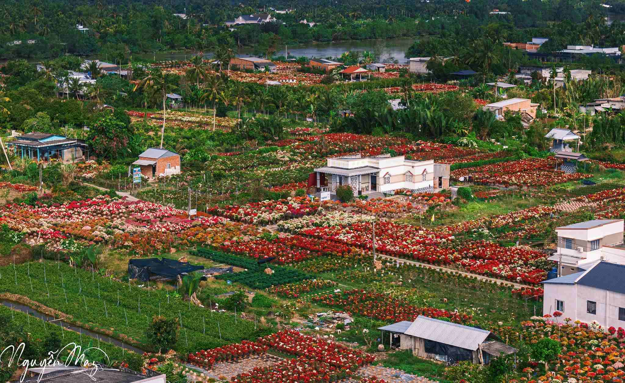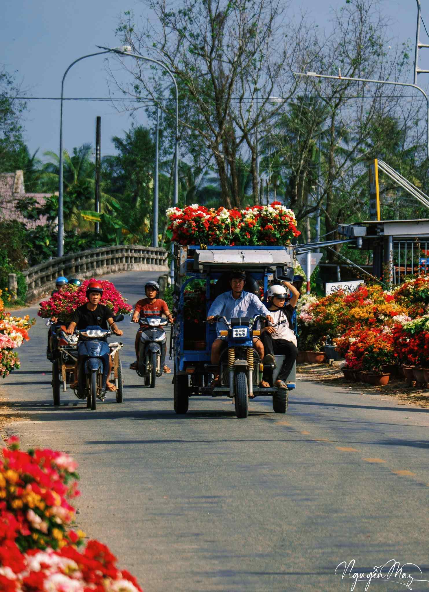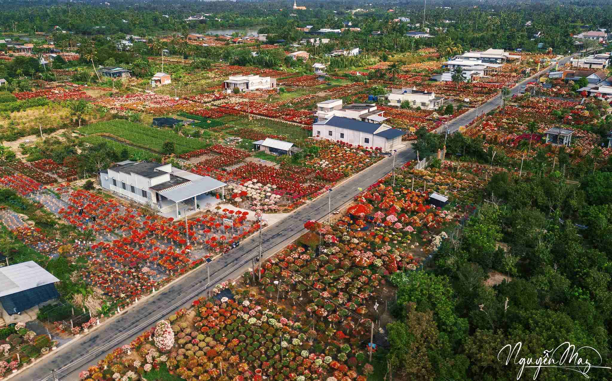 Dọc các tuyến đường và khu vườn trong xã, hoa được bày bán san sát, tạo nên những mảng màu nổi bật. Ảnh: Nguyễn May