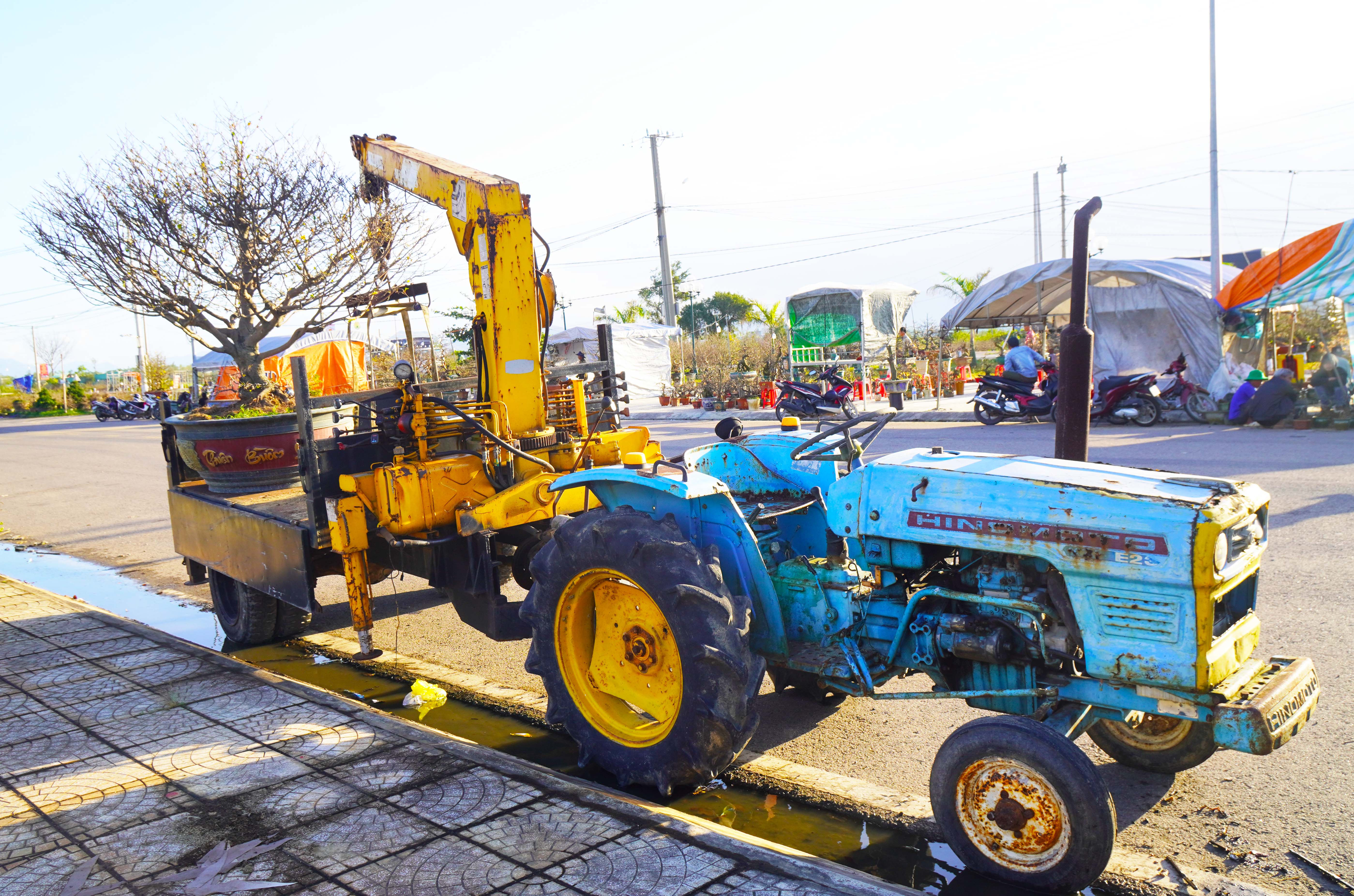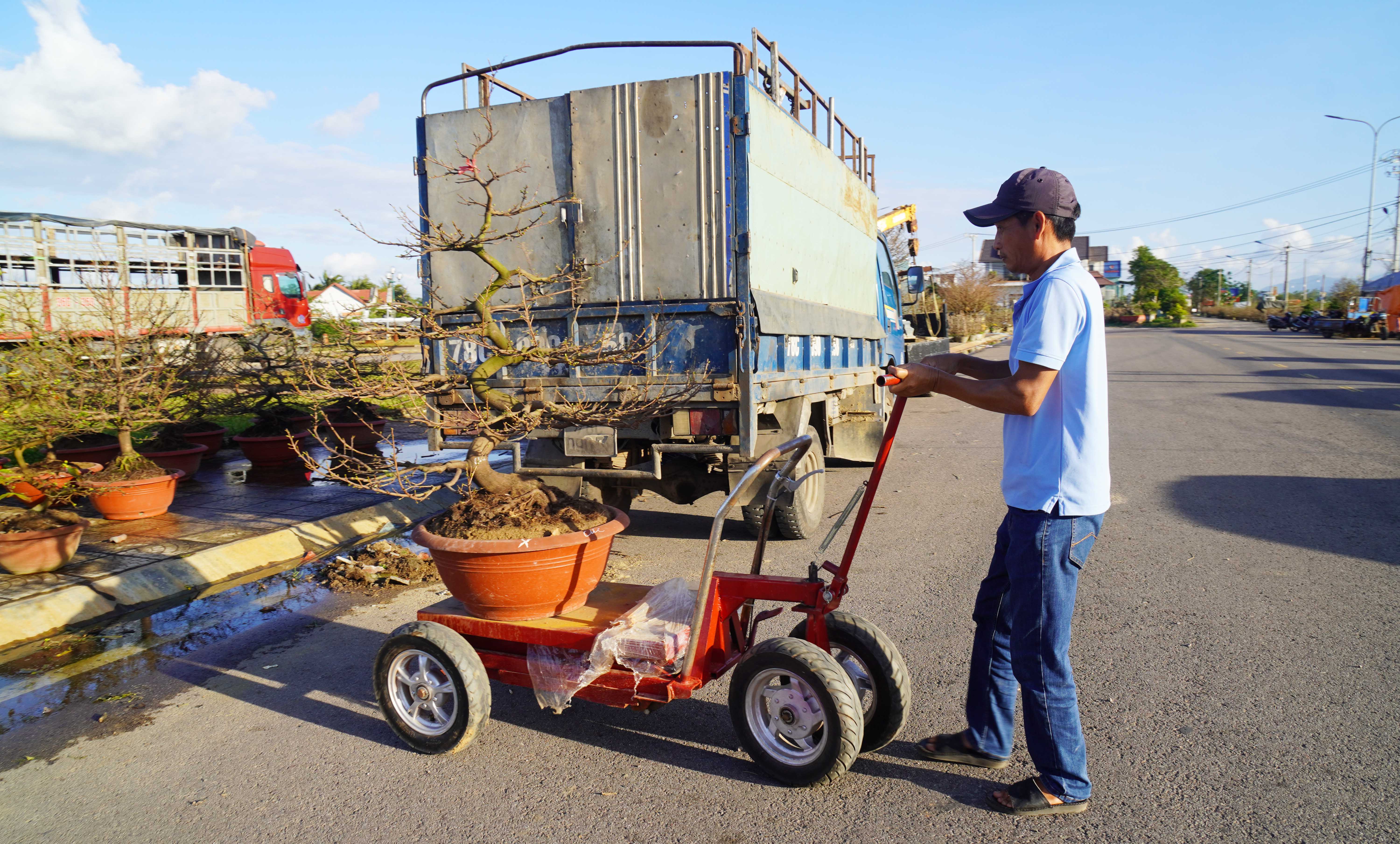 Sử dụng xe cơ giới để vận chuyển các chậu mai tết lên điểm trưng bày tập trung ven Quốc lộ 1A