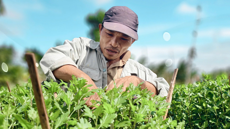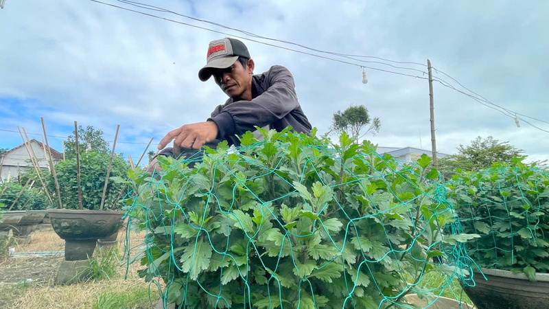 Gần 2 tháng nữa đến Tết Nguyên đán Bính Ngọ 2026, những ngày này, người dân tại các vùng trồng hoa ở Quảng Ngãi đang tất bật chăm sóc cây hoa để phục vụ thị trường Tết. Ông Nguyễn Văn Nhất (45 tuổi, thôn Đồng Viên) đang tỉ mẫn cắm từng cây tre được chẻ nhỏ để định hình cho gần 800 chậu cúc trong vườn. Theo ông Nhất, vụ hoa Tết thường được chuẩn bị từ khoảng tháng 7 âm lịch thì bắt đầu gieo giống để trồng. Từ khi gieo đến khi lớn rồi xuất bán khoảng chừng 5 tháng. “Nói thì nghe đơn giản, nhưng để trồng được một chậu cúc thì ngoài kinh nghiệm còn lại nhờ thuốc men và cả… may mắn nữa”, ông Nhất cười nói.