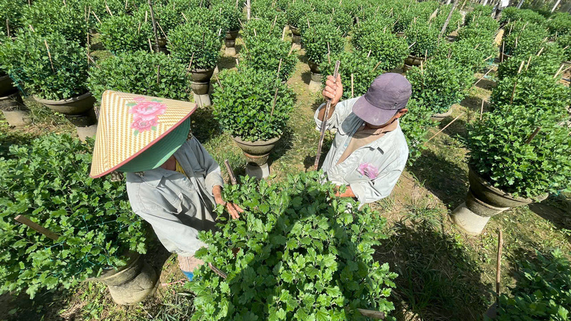 Người nông dân trồng hoa tỉ mẫn chăm sóc những chậu cúc lớn đang bước vào giai đoạn hình thành dáng.