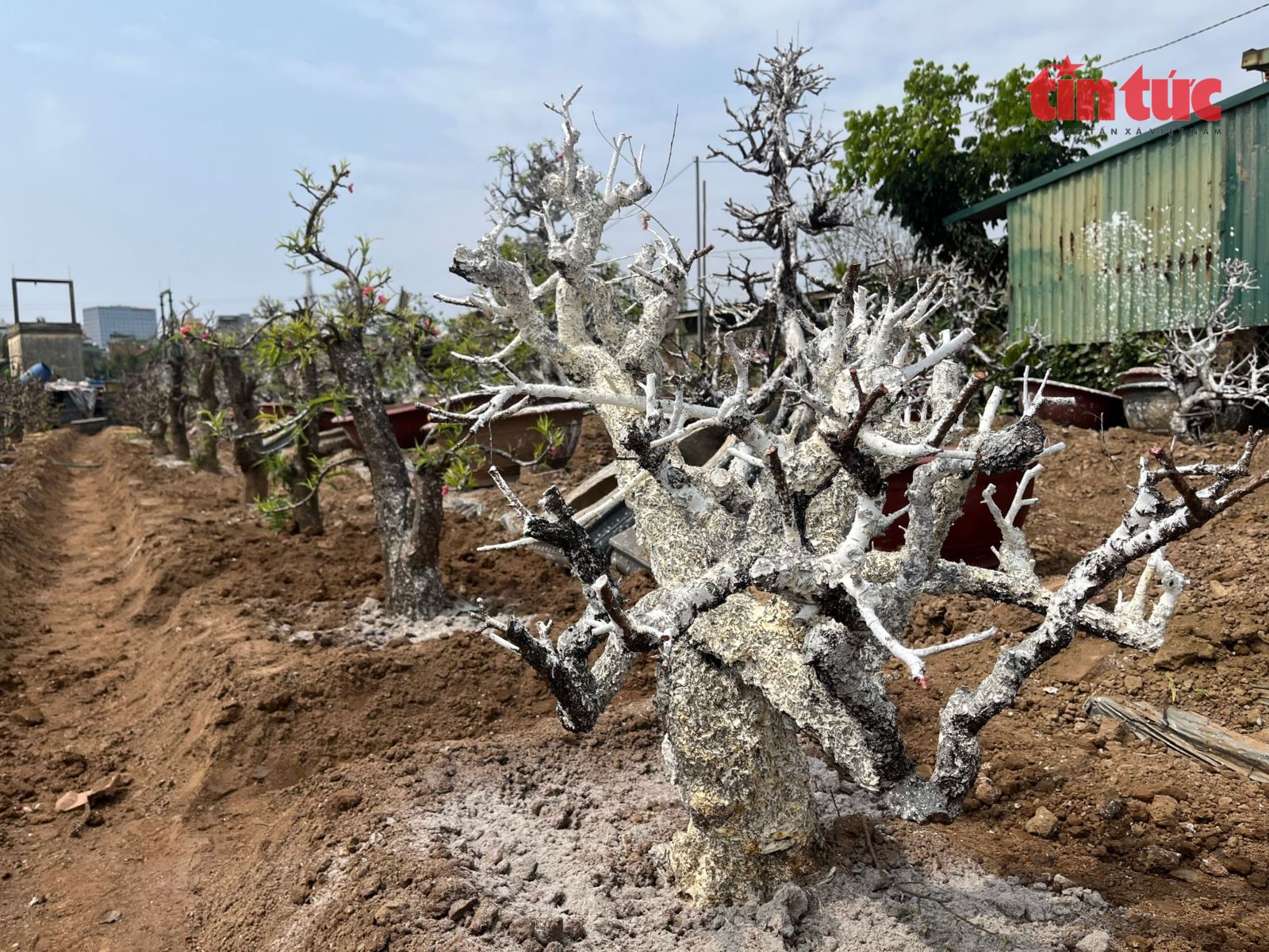 Một gốc đào được bôi vôi để chống nấm mốc.