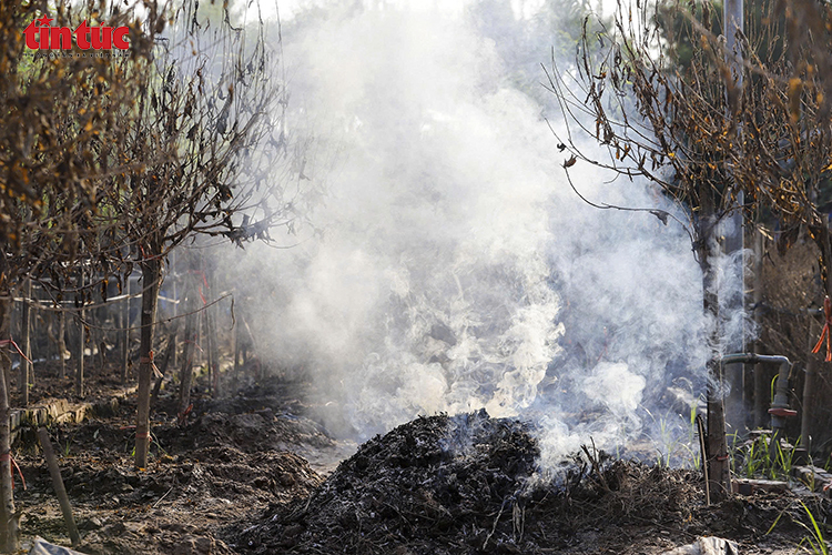 Những cây khô héo được người dân chất thành từng đống lớn và đốt.