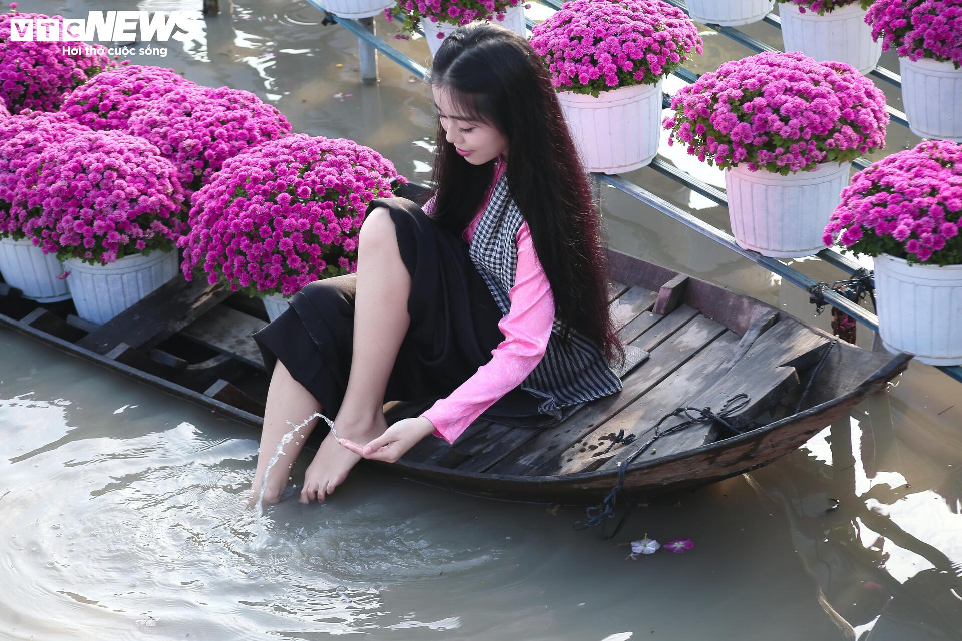 Nhiều du khách, đặc biệt là các bạn trẻ, lựa chọn diện áo bà ba kết hợp khăn rằn - trang phục đặc trưng Nam Bộ để check-in, lưu giữ những khoảnh giữa không gian ngập tràn sắc hoa.