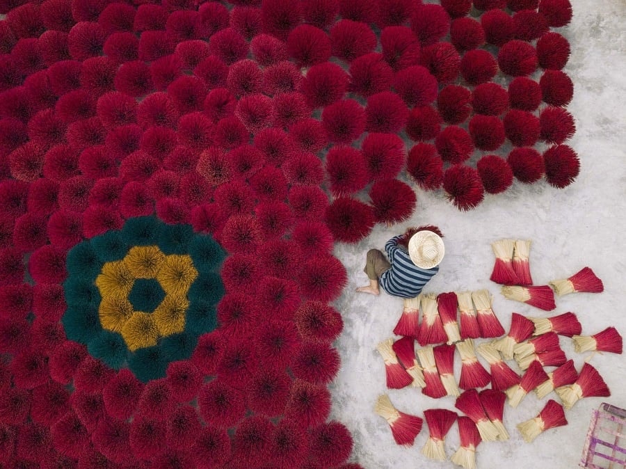Những bó chân hương được phơi khô tạo nên khung cảnh rực rỡ tại Quảng Phú Cầu.