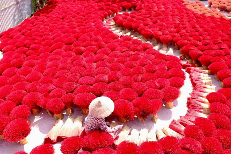 Nghề làm hương ở Quảng Phú Cầu có lịch sử hơn 100 năm, dù nhiều công đoạn nay được hỗ trợ bằng máy móc, nhưng kỹ thuật thủ công từ chẻ vầu, nhuộm phẩm đến se hương vẫn được người dân giữ gìn qua nhiều thế hệ. Nhờ đó, hương Quảng Phú Cầu không chỉ nổi tiếng trong nước mà còn được xuất khẩu sang nhiều quốc gia châu Á. Ảnh Vinpearl