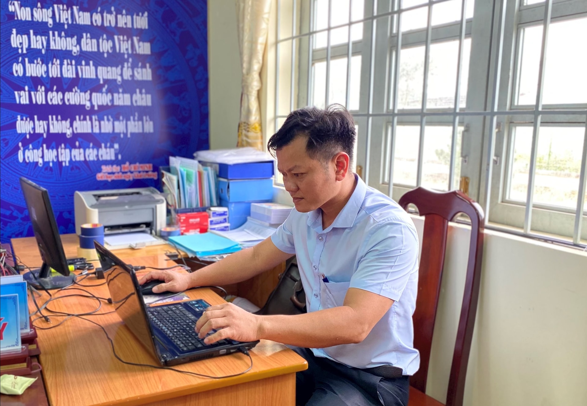 Thầy Nguyễn Duy Chinh, Hiệu trưởng Trường Tiểu học, THCS R’Teing, xã Phú Sơn Lâm Hà
