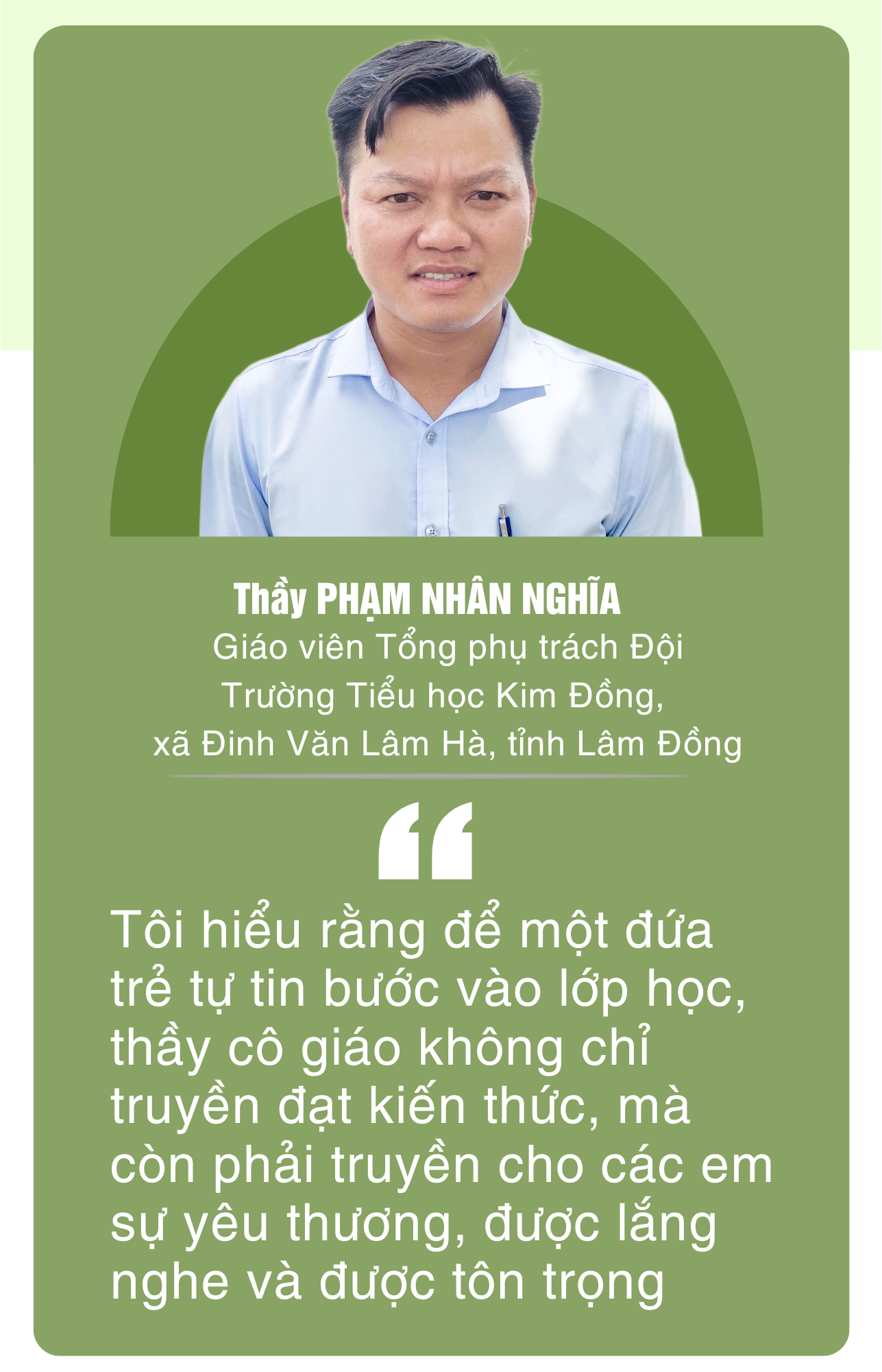 Trong đó, thầy Nghĩa là giáo viên, Tổng phụ trách Đội rất tâm huyết, năng nổ sáng tạo trong công tác, đặc biệt có nhiều hoạt động chăm lo học sinh khó khăn, lan tỏa tình yêu thương, thắp lên trong các em động lực học tập, niềm tin về một tương lai tốt đẹp hơn.