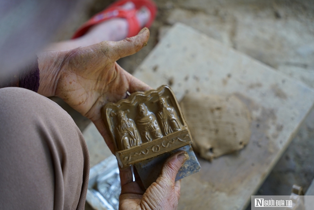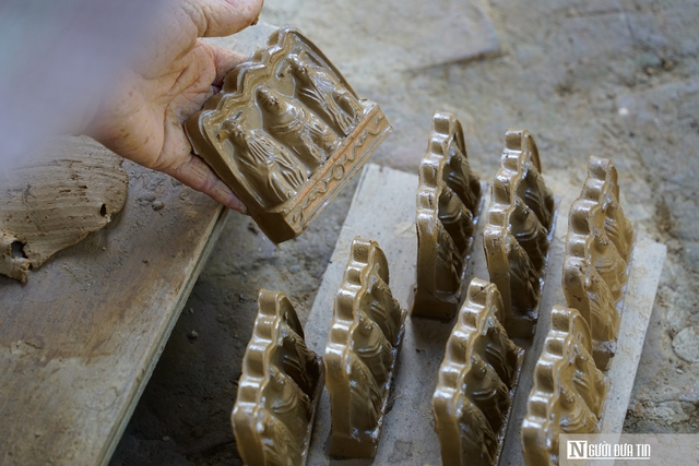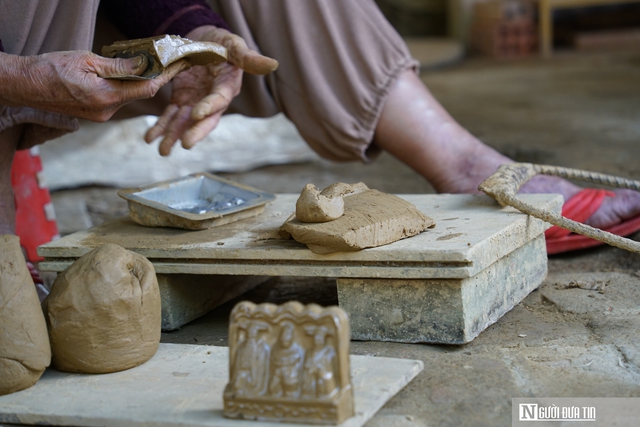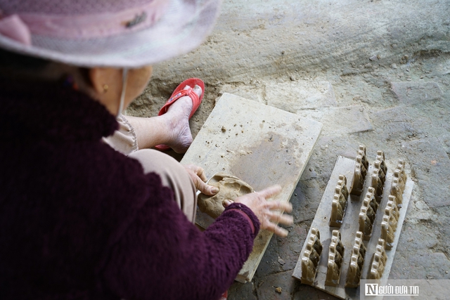 Trong căn nhà nhỏ, bà Ca vừa thoăn thoắt nén đất vào khuôn, vừa giải thích từng công đoạn. Trước khi in tượng, khuôn phải được bôi một lớp dầu mỏng. "Không có dầu là đất dính liền, lấy ra không được, hư bề mặt hết", bà nói. Động tác quen thuộc, dứt khoát, cho thấy kinh nghiệm tích lũy qua hàng chục năm.