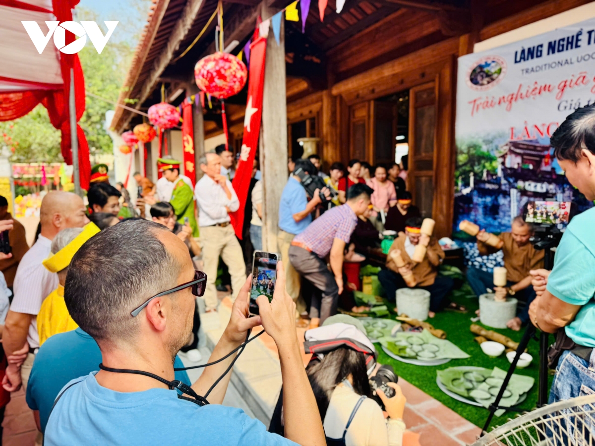 Một du khách nước ngoài thích thú ghi lại không khí trình diễn giã giò chả truyền thống tại Ước Lễ.