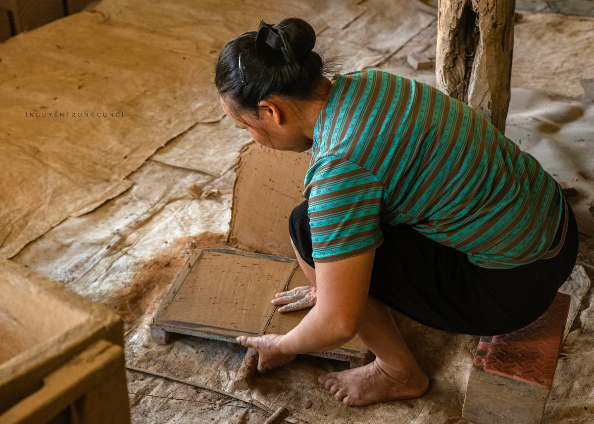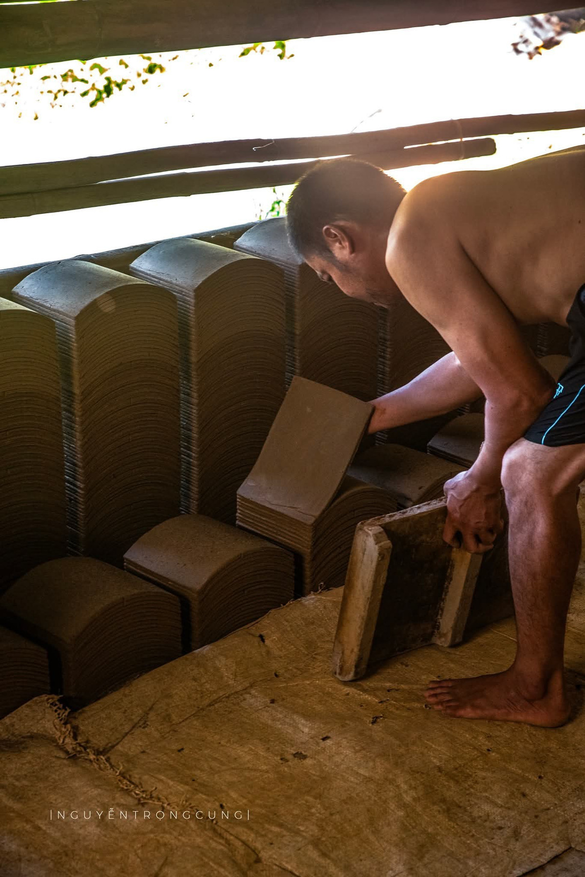 Từ sáng sớm, người dân đã bắt đầu công việc quen thuộc: nhào đất, đóng khuôn, phơi ngói. Những đôi bàn tay dính đầy đất sét vẫn thoăn thoắt, từng viên ngói được tạo hình tỉ mỉ và xếp ngay ngắn trên sân. Ảnh Nguyễn Trọng Cung