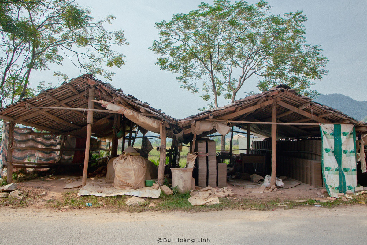 Từ chân đèo Tam Canh, chỉ cần rẽ trái chừng 50 mét, du khách đã có thể bắt gặp khung cảnh rất đặc trưng của làng nghề: hai bên đường là những lán trại làm ngói nằm san sát, khói lò nhẹ bay, mùi đất sét trộn lẫn hương củi ngai ngái. Ảnh Bùi Hoàng Linh