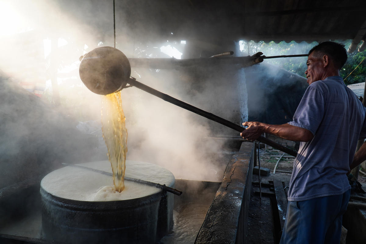 Quá trình nấu đòi hỏi người làm phải thường xuyên canh lửa, khuấy đều để nước mía cô đặc dần thành mật. Khi đạt độ sánh và màu sắc phù hợp, mật được đưa ra khỏi bếp, làm nguội và đóng gói để tiêu thụ. Ảnh: Đình Minh