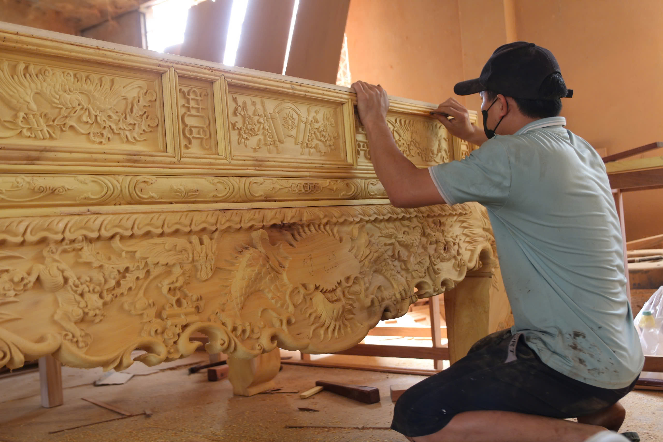 Một thợ mộc hoàn thiện chi tiết trên sản phẩm đồ thờ trước khi xuất xưởng.