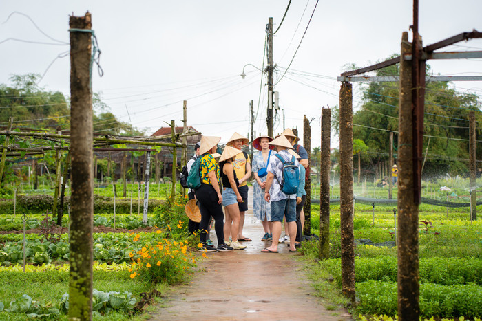 Đến với làng Trà Quế, du khách có thể đi bộ hoặc đạp xe dọc những luống rau xanh mướt, tận hưởng không khí trong lành vào sáng sớm hoặc chiều mát. Đặc biệt, nhiều người thích thú khi được trải nghiệm làm nông dân, tự tay cuốc đất, gieo hạt, bắt sâu, chăm rau…