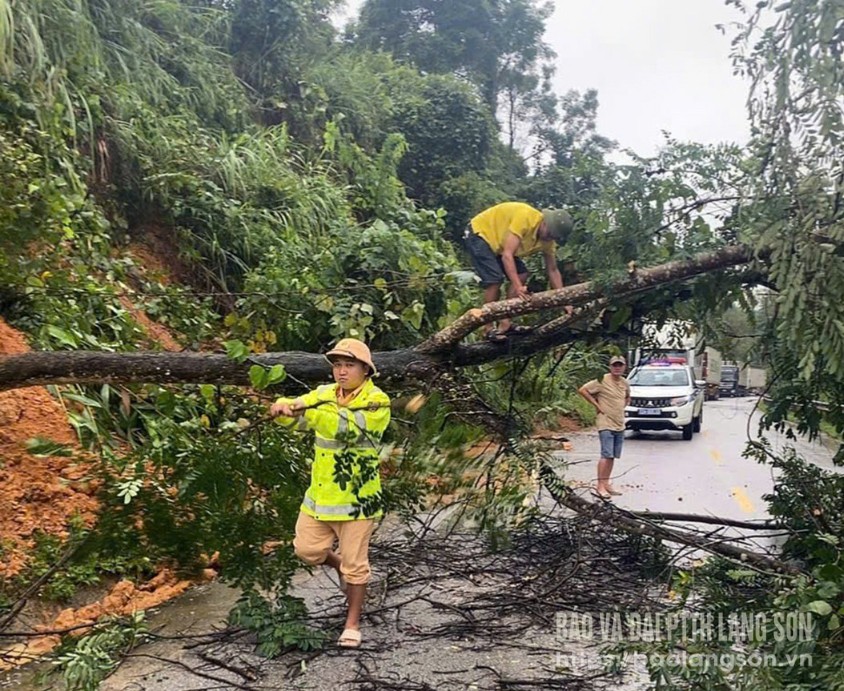 Lực lượng CSGT, Công an tỉnh Lạng Sơn hỗ trợ người dân xử lý cây đổ gây ách tắc giao thông trên tuyến quốc lộ 4A, đoạn qua địa bàn tỉnh Lạng Sơn