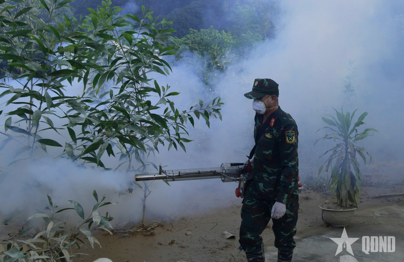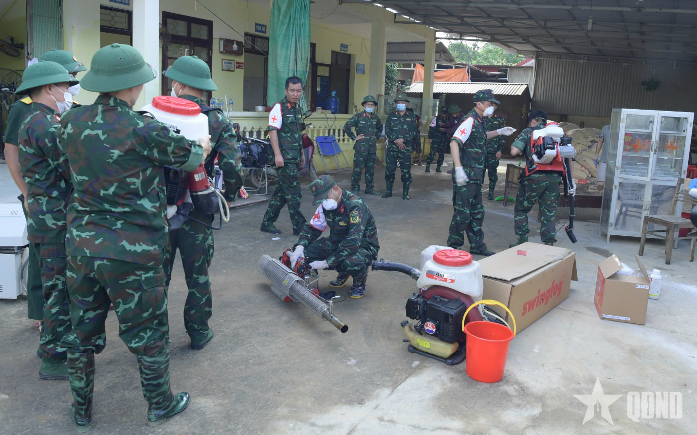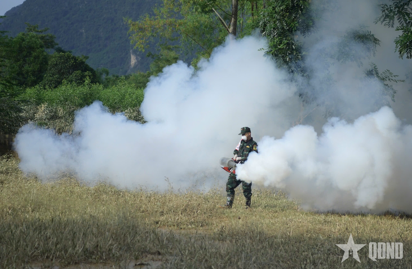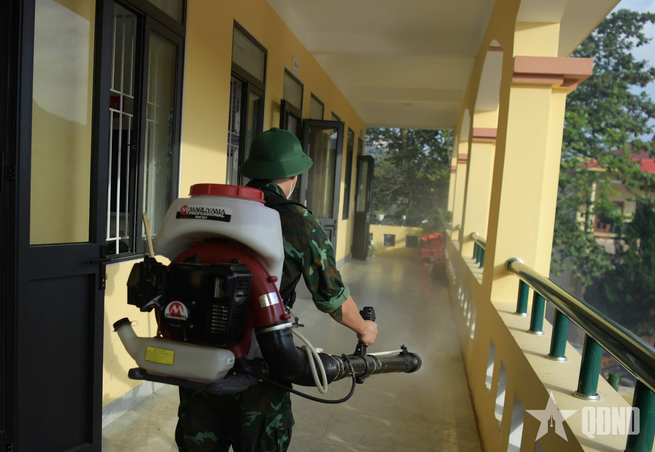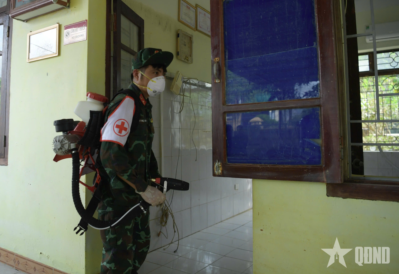 Lực lượng quân y tập trung làm sạch môi trường, khử khuẩn, vệ sinh phòng dịch tại các trường học, cơ sở y tế, trụ sở các cơ quan.