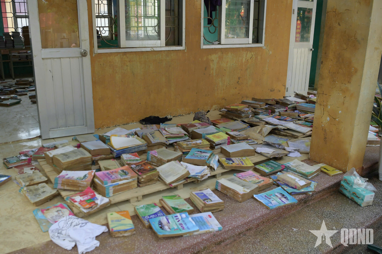 Cán bộ, chiến sĩ Trung đoàn 12, Sư đoàn 3 khắc phục hậu quả mưa lũ tại điểm Trường THCS Yên Bình, Lạng Sơn (ảnh trên); sách vở của học sinh bị hỏng do mưa lũ (ảnh dưới).