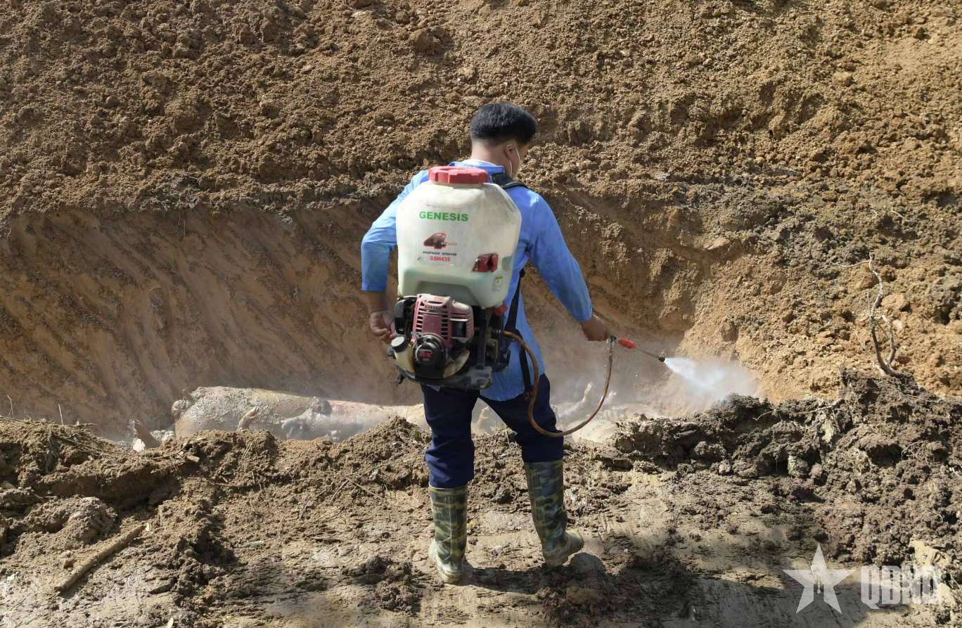 Lực lượng chức năng xã Yên Bình, tỉnh Lạng Sơn thu gom tiêu hủy xác động vật chết, rác thải và tiến hành phun khử khuẩn tại các điểm ô nhiễm nặng.