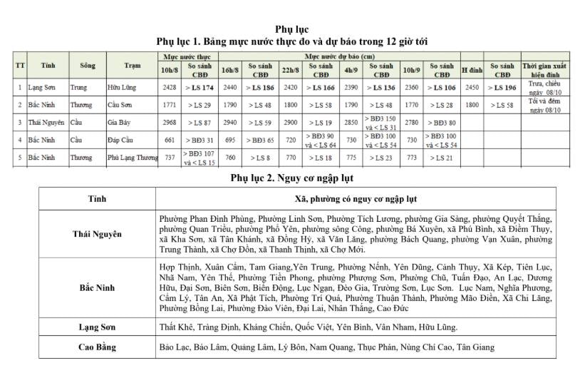 Lưu ý, ngập lụt diện rộng tại các tỉnh Thái Nguyên (duy trì trong 3-4 ngày tới), Bắc Ninh, Lạng Sơn, Cao Bằng và nguy cơ ngập lụt tại các vùng trũng thấp ven sông, các khu đô thị thuộc khu vực Bắc Bộ; nguy cơ sạt lở bờ sông, đê sông, nguy cơ lũ quét trên các sông suối và sạt lở đất trên các sườn dốc ở khu vực vùng núi Bắc Bộ.