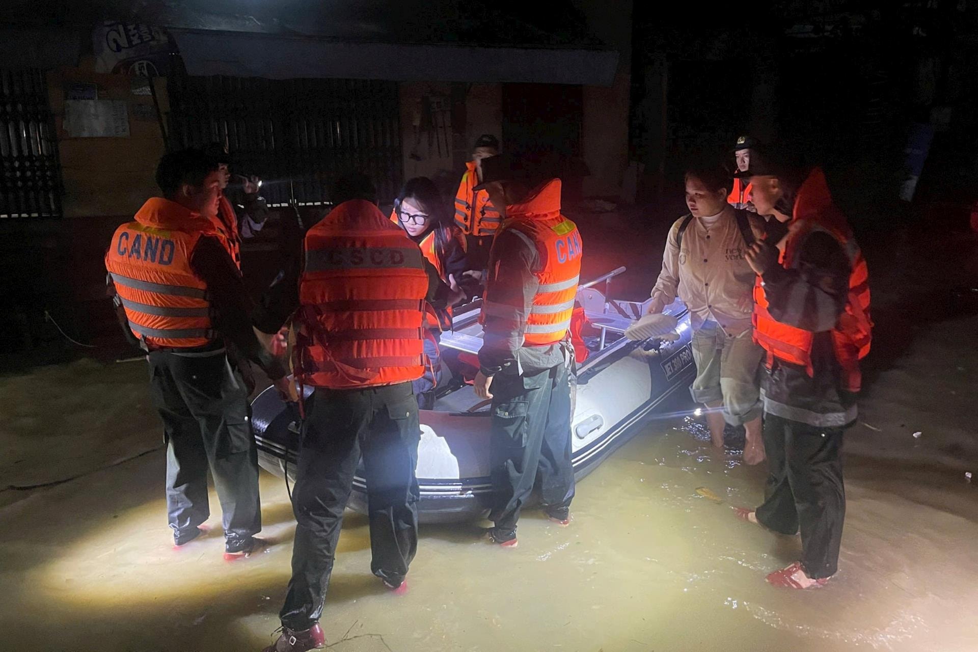 Lực lượng CAND hỗ trợ người dân di chuyển ra khỏi khu vực bị ngập lụt vào đêm 7/10, tại xã Thất Khê, tỉnh Lạng Sơn.