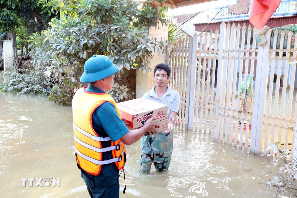 Lực lượng quân sự xã Vân Nham, tỉnh Lạng Sơn cùng đoàn cứu trợ tiếp tế nhu yếu phẩm cho người dân tại vùng ngập lụt. (Ảnh: Văn Đạt/TTXVN)