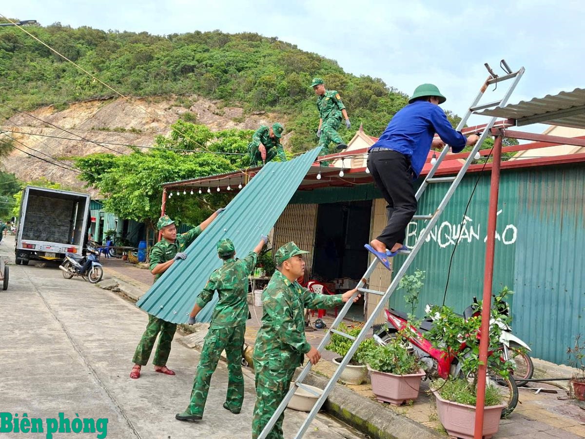 Cán bộ, chiến sĩ Đồn Biên phòng Đảo Trần, Bộ đội Biên phòng tỉnh Quảng Ninh hỗ trợ người dân khắc phục hậu quả do bão gây ra. Ảnh: Hoàng Cương