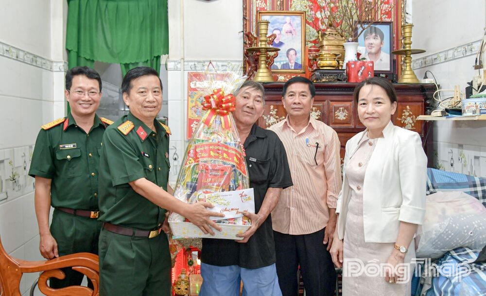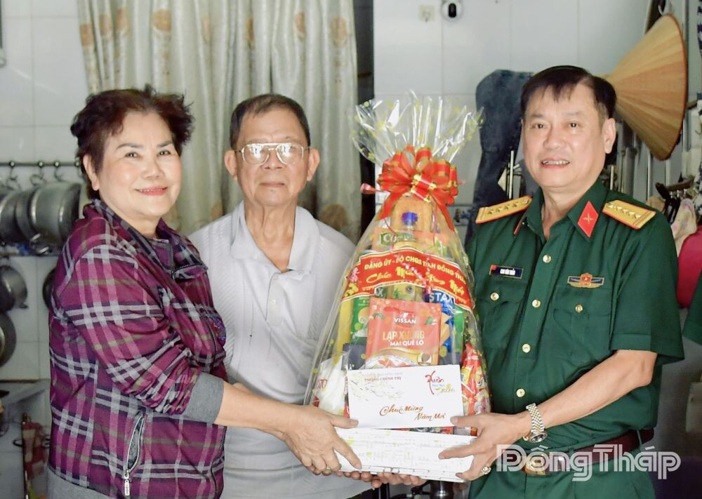 Đại tá Cao Văn Thảo, Phó Chính ủy Bộ Chỉ huy Quân sự tỉnh Đồng Tháp cùng chính quyền địa phương tặng quà tết cho gia đình đồng chí Thiếu tá Quân nhân chuyên nghiệp Phạm Hồng Quang đang công tác tại Vùng 4 Hải quân.