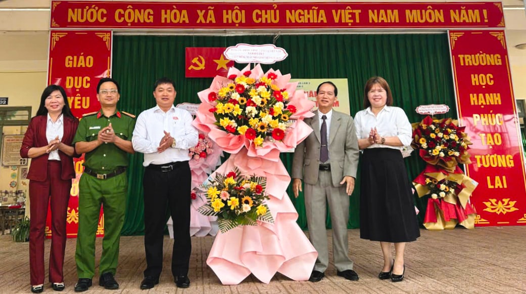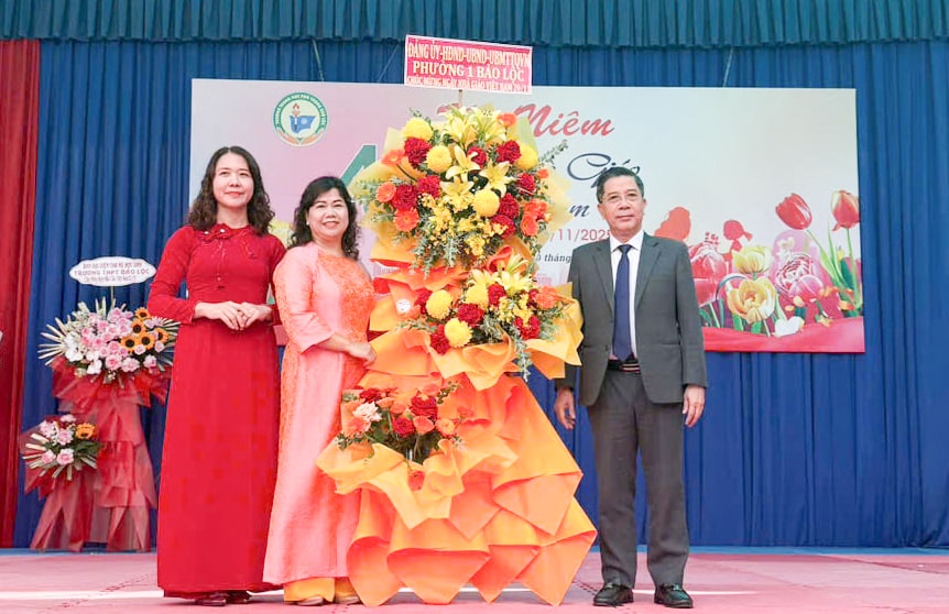 Đồng chí Nguyễn Minh Châu, Bí thư Đảng ủy, Chủ tịch HĐND Phường 3 Bảo Lộc đến thăm và tặng hoa chúc mừng các thầy, cô giáo