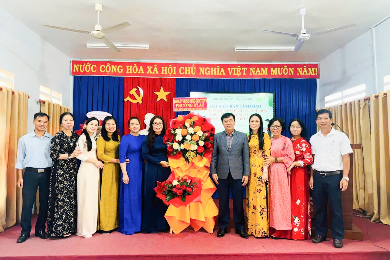 Đồng chí Nguyễn Trung Kiên, Tỉnh ủy viên, Bí thư Đảng ủy phường B'Lao đến thăm và chúc mừng các thầy cô giáo