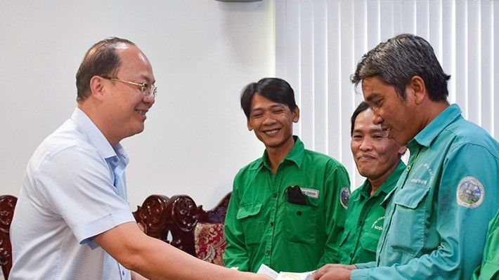 Đồng chí Nguyễn Hồ Hải, Bí thư Tỉnh ủy Cà Mau trao quà Tết các công nhân tại phường Bạc Liêu.