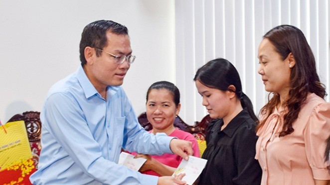 Đồng chí Tô Việt Thu (nữ, đứng giữa), Bí thư Đảng ủy phường Bạc Liêu trao quà Tết cho người lao động.