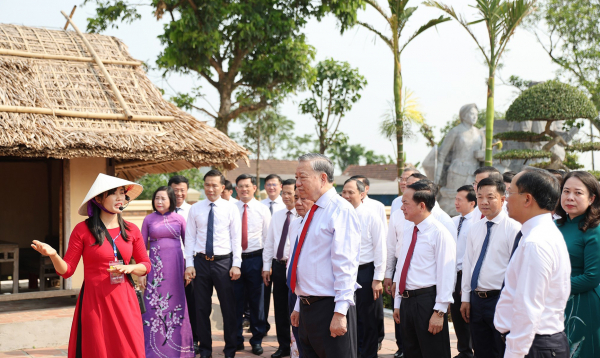 Tổng Bí thư, Chủ tịch nước Tô Lâm và đoàn công tác tham quan ngôi nhà tranh tại Khu di tích Tổng Bí thư Hà Huy Tập (xã Cẩm Hưng).